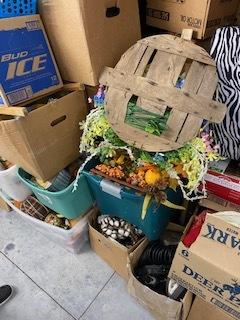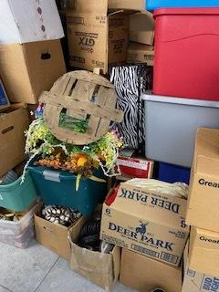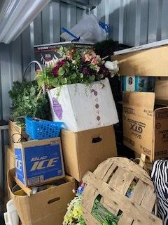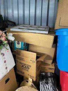 This unit appears to contain…This unit appears to contain: boxes, totes, fake flower, suit case, trash bags