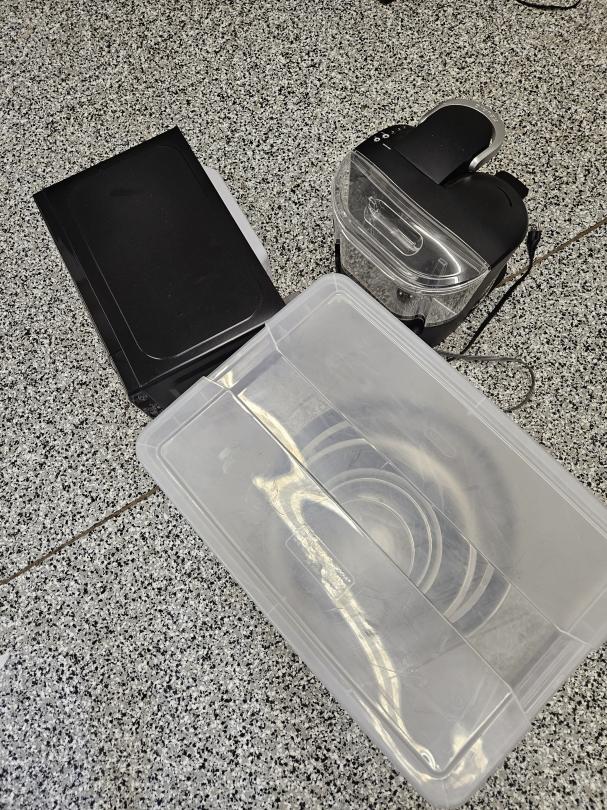 This unit appears to contain…Misc kitchen and supplies. Coffee machine, microwave and stainless steel bowls.