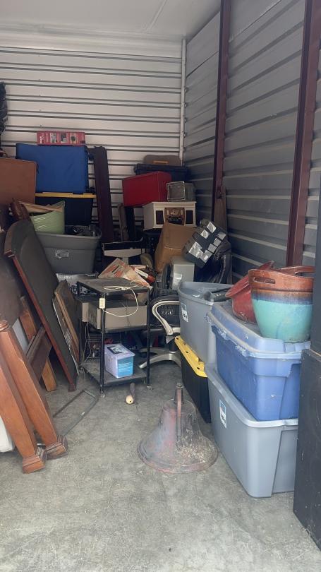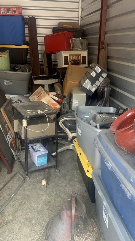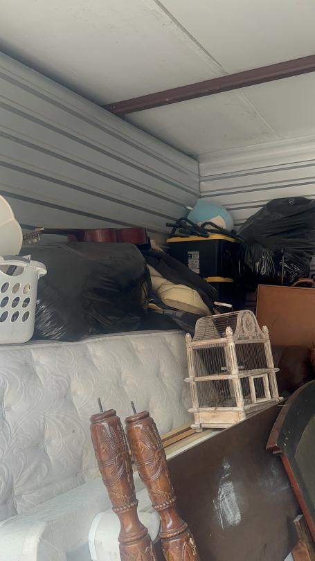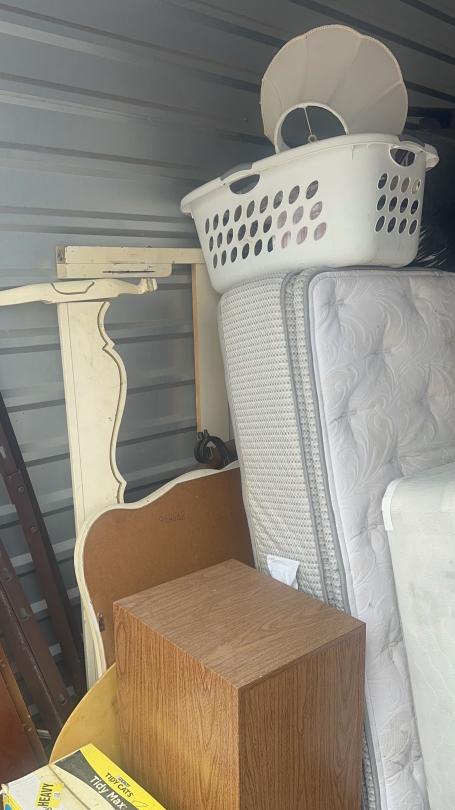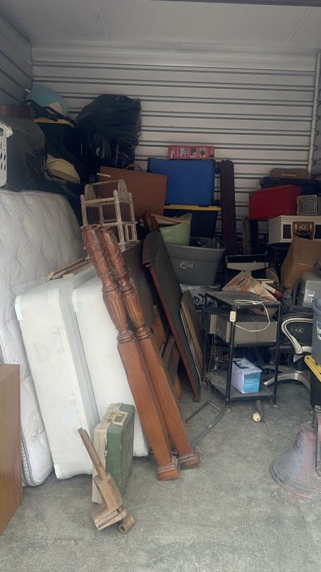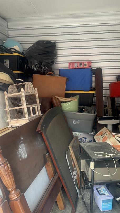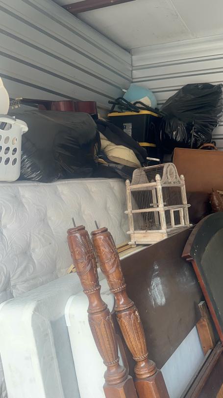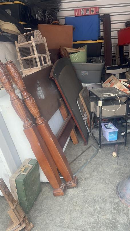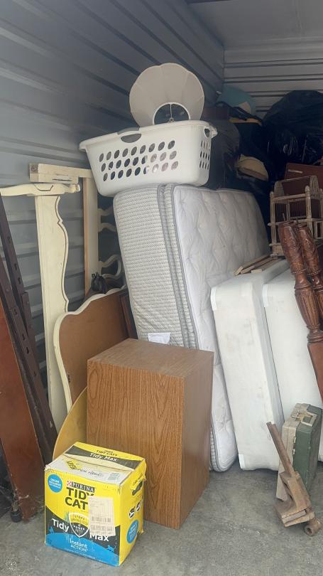This unit appears to contain…Unit appears to contain speakers, bed frame, tables, bird cage, mattress, baskets, bags, totes, guitar, stereo, office chairs, plant pots, and old radio.