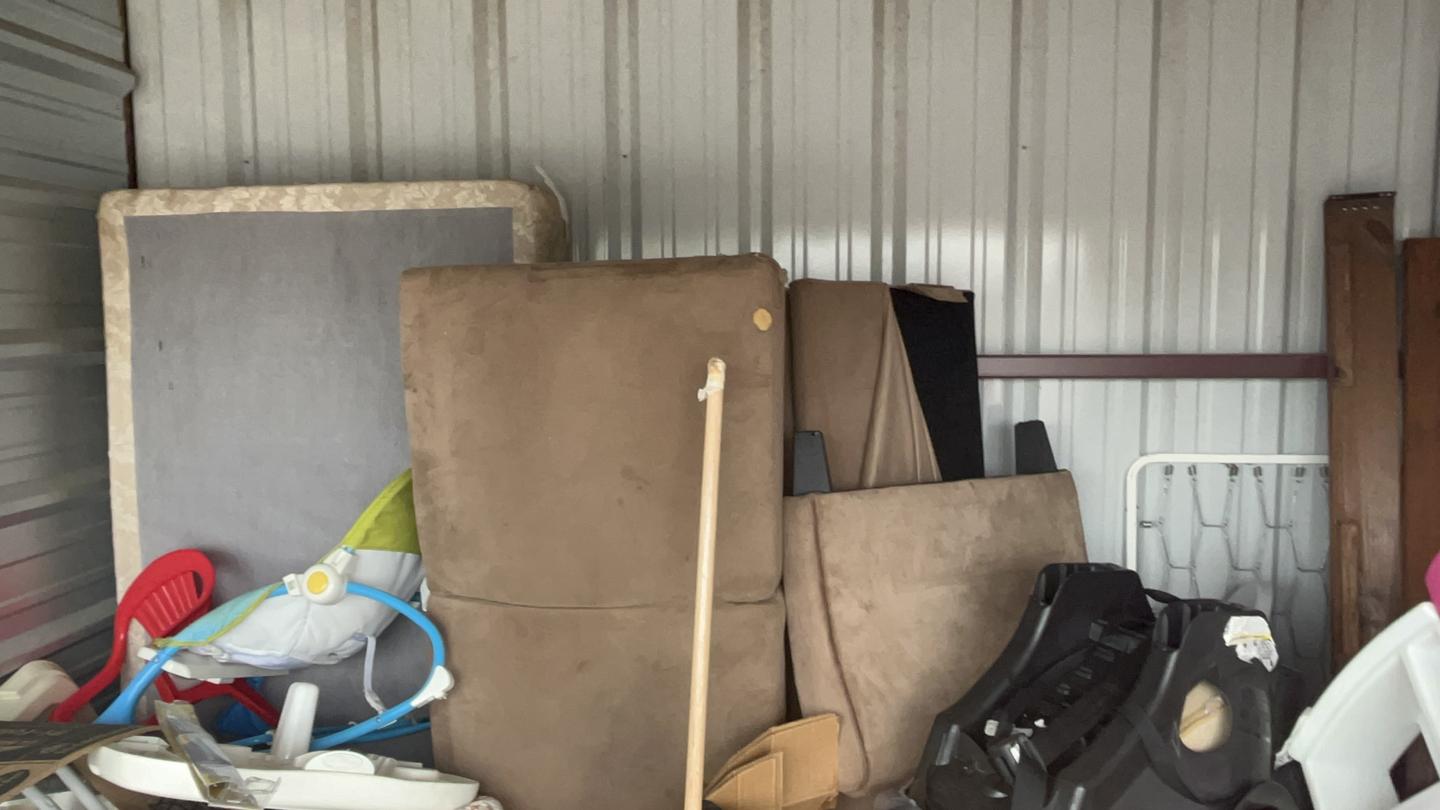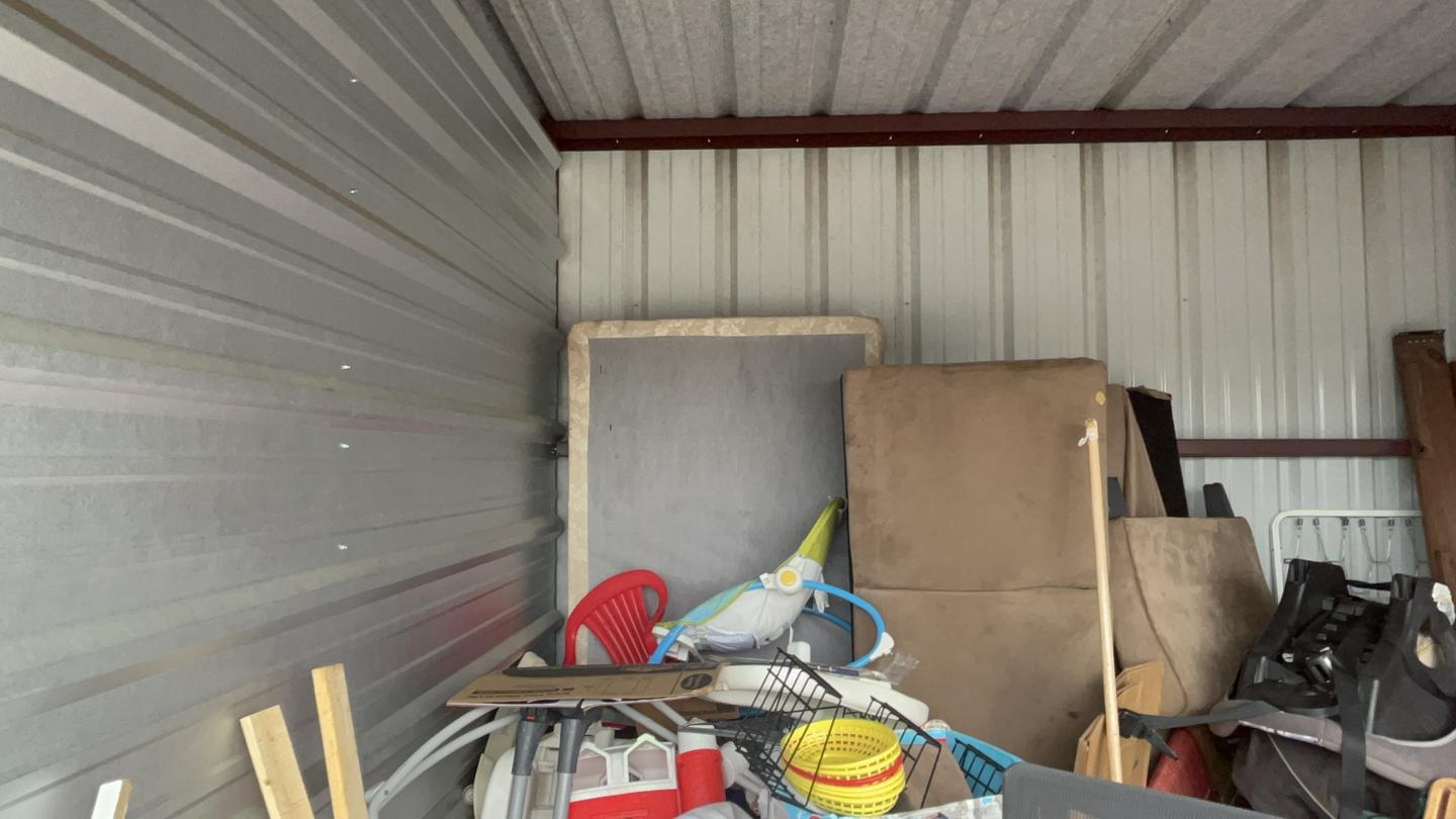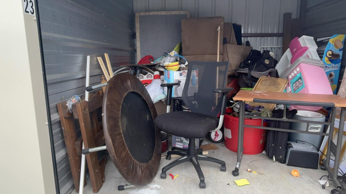 This unit appears to contain…This unit appears to contain: trampoline, boxes, totes, office chair, desk, toys, mattress, box spring, headboard, soccer goal, car seat, footboard, vacuum