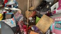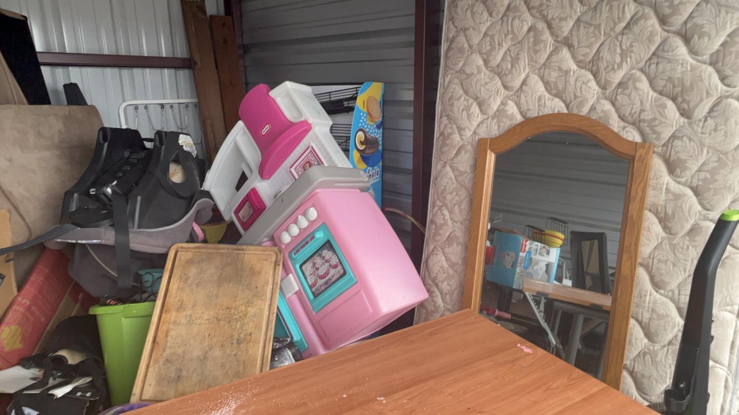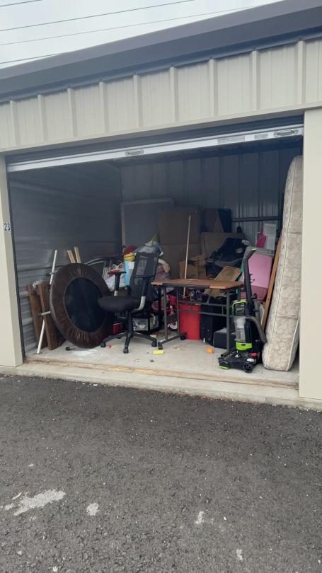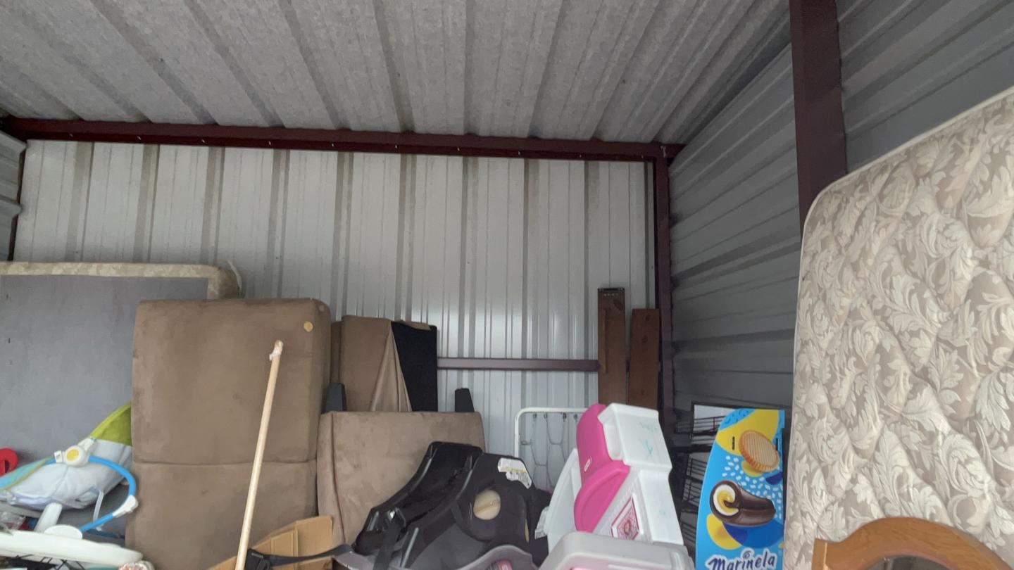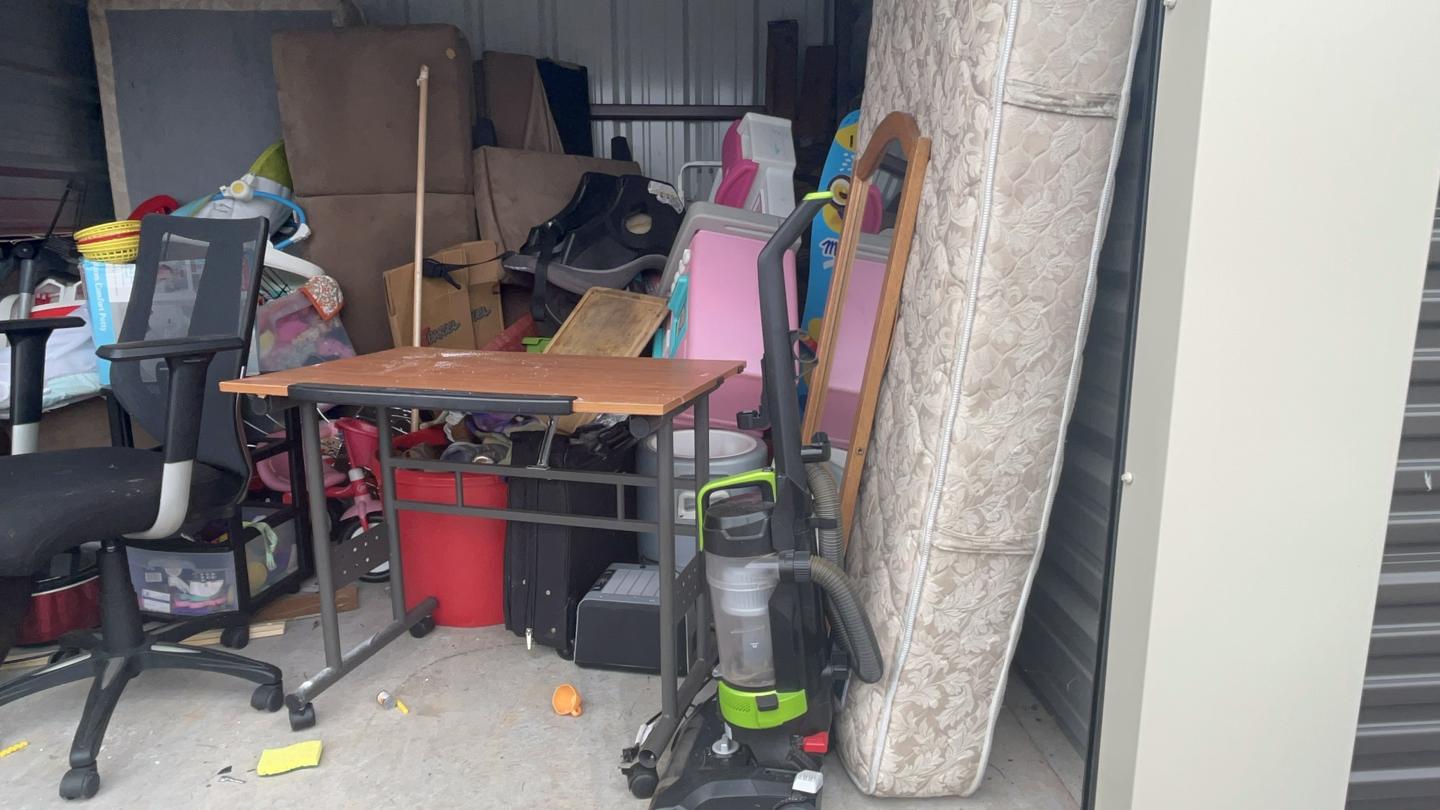 This unit appears to contain…This unit appears to contain: trampoline, boxes, totes, office chair, desk, toys, mattress, box spring, headboard, soccer goal, car seat, footboard, vacuum