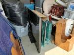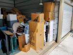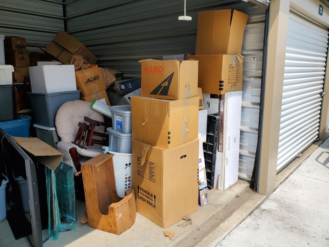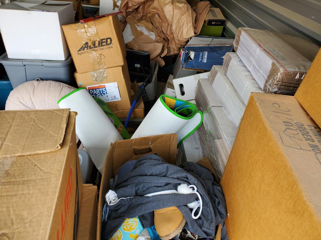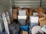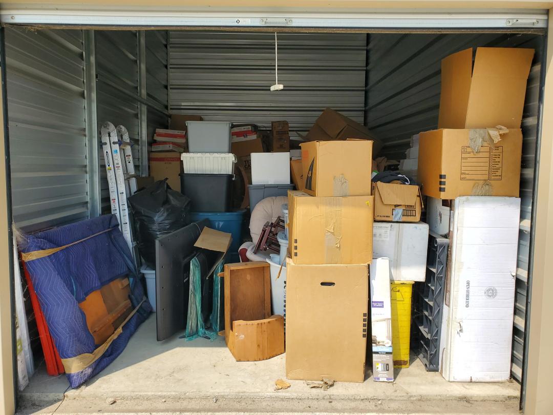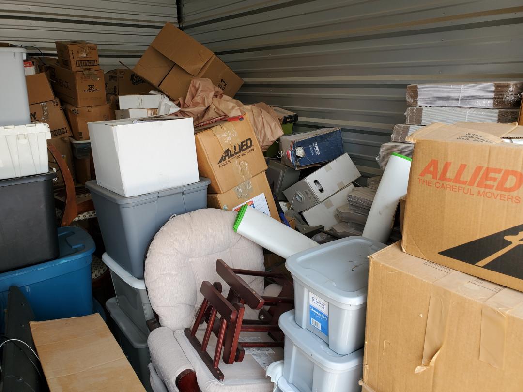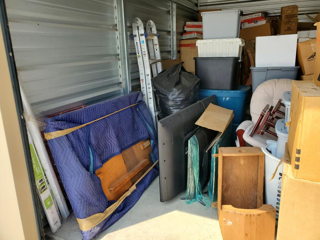 This unit appears to contain…Folding ladder, wood table top, wood baby cradle, laundry baskets, many plastic tubs/totes, boxes, 3 flat screen televisions, glider rocker and glider stool, upholstered wooden chairs, boxes