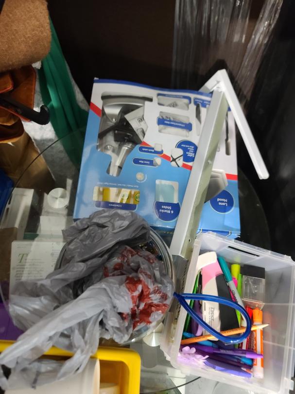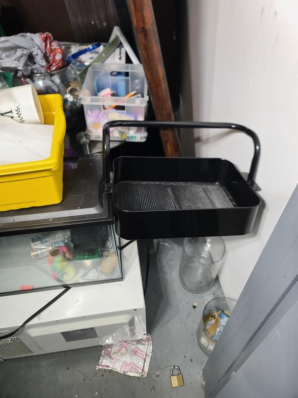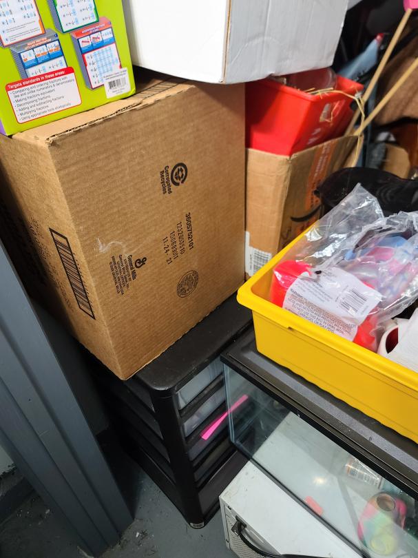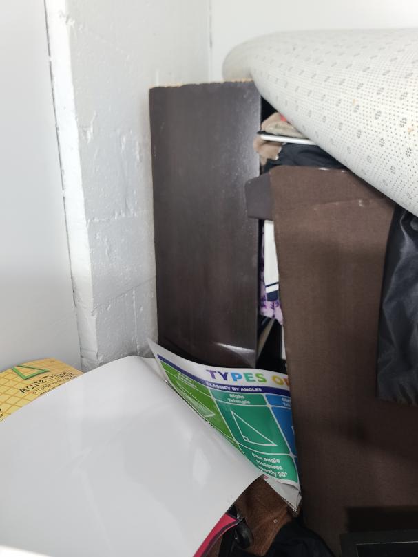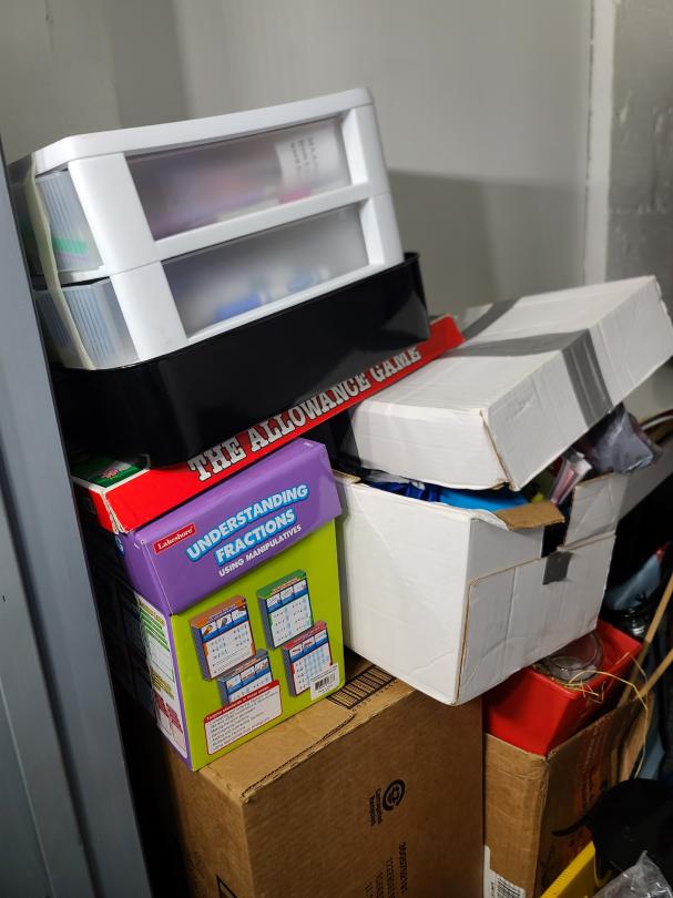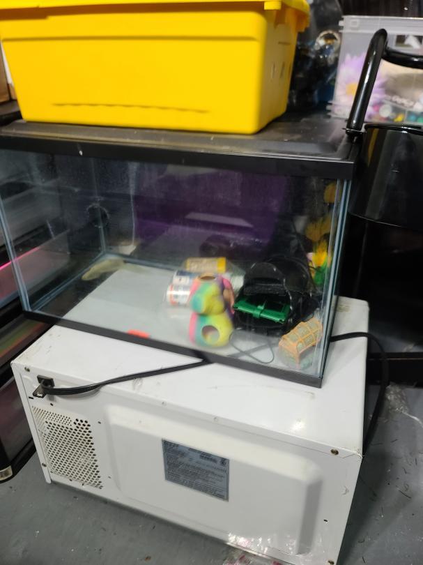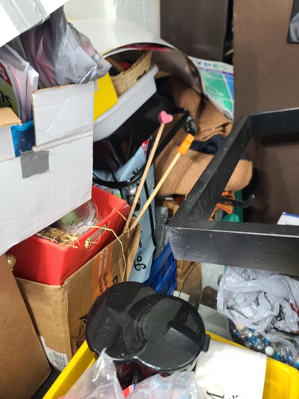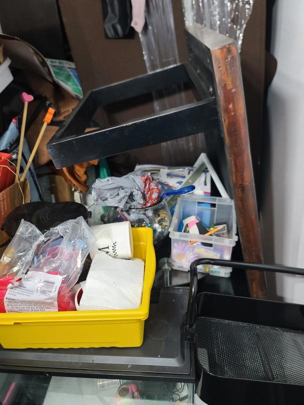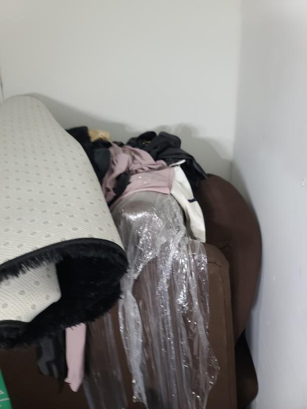 This unit appears to contain…Love seat, coffee table, fish tank, microwave, area rug, bookshelf, clothes, boxes, plastic containers, children toys, metal tray, etc