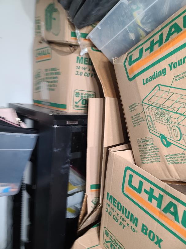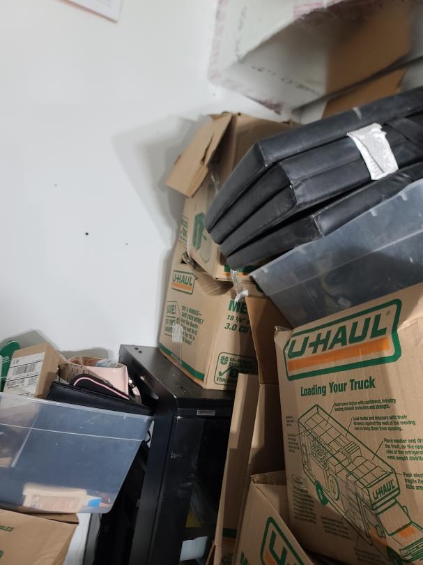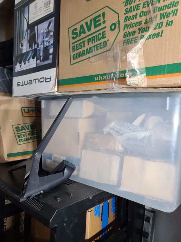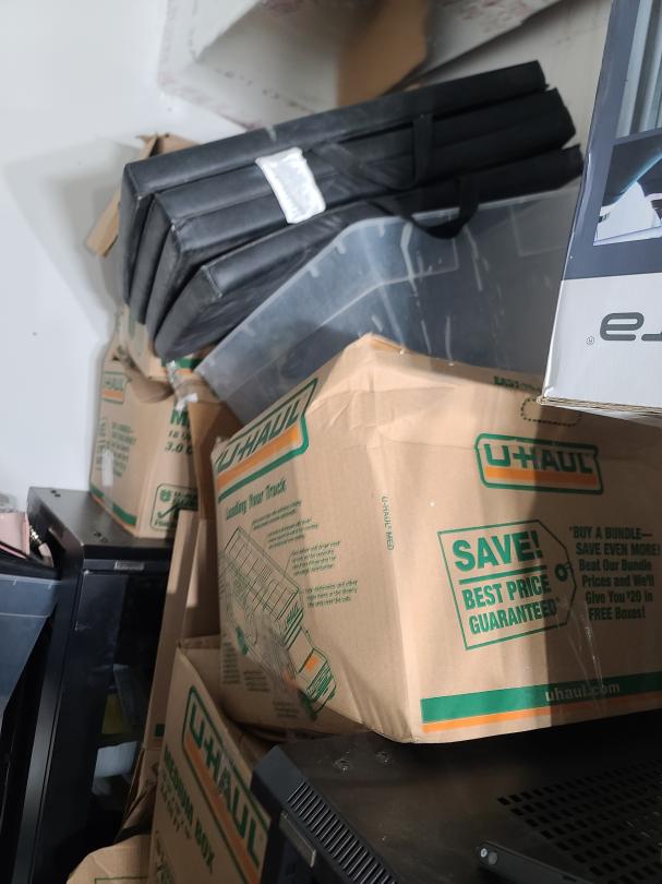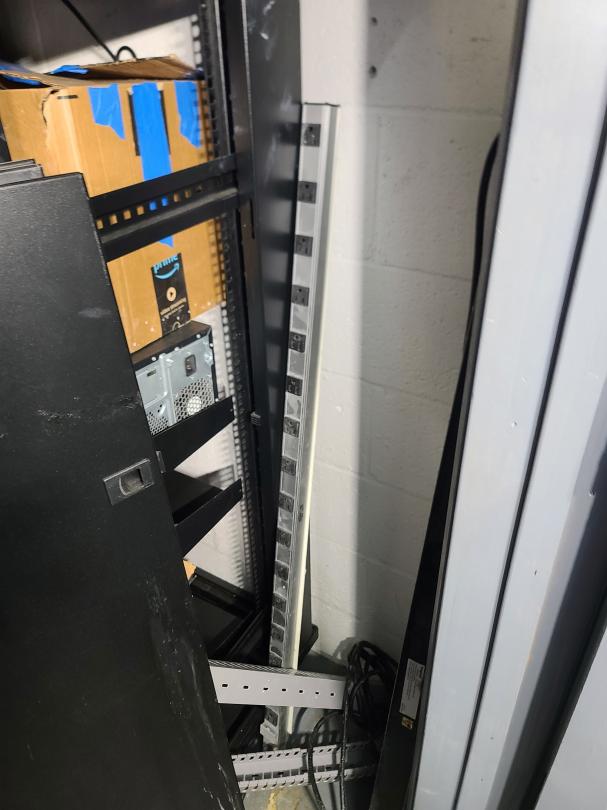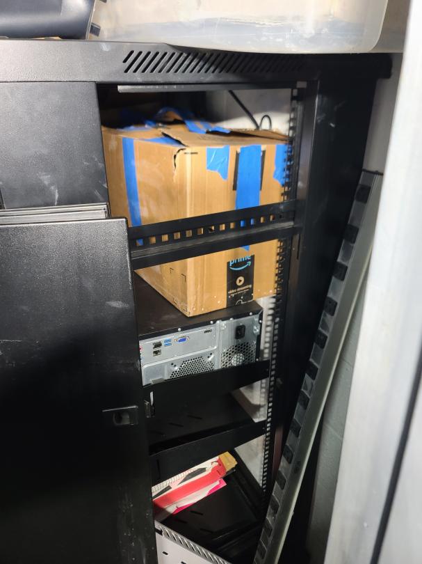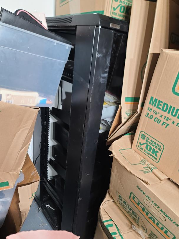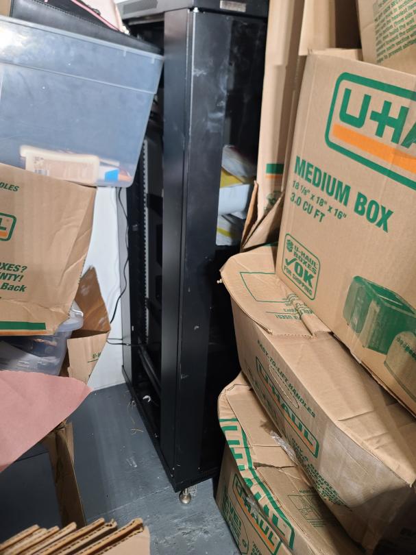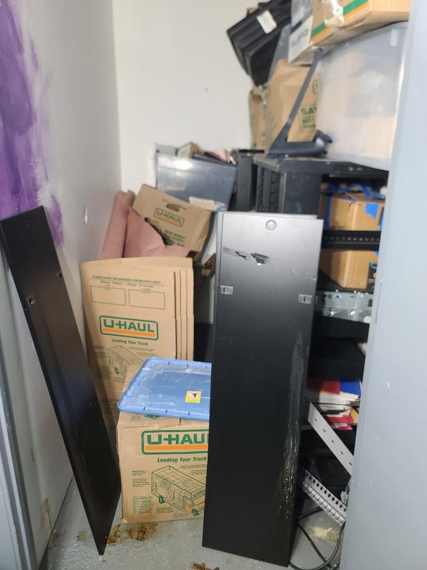This unit appears to contain…Electronics server racks open frame, amplifier home theater system, computer, plastic totes, boxes