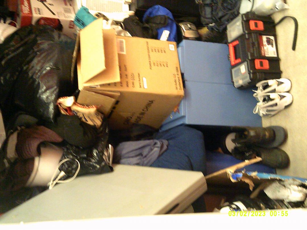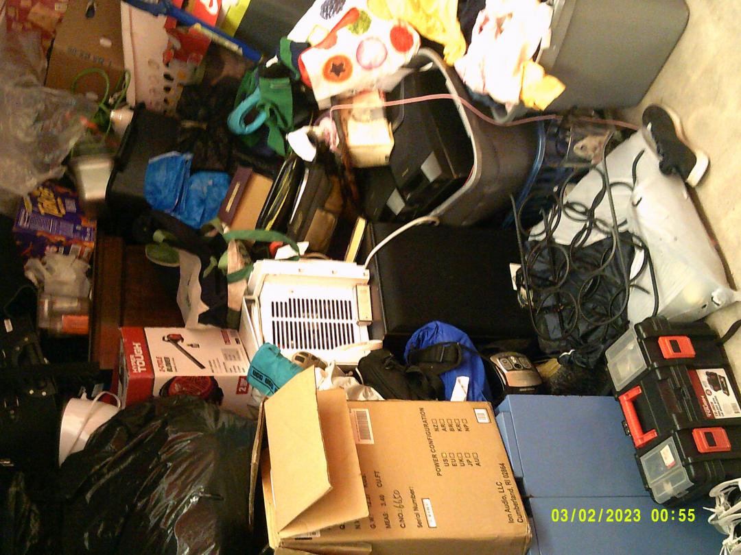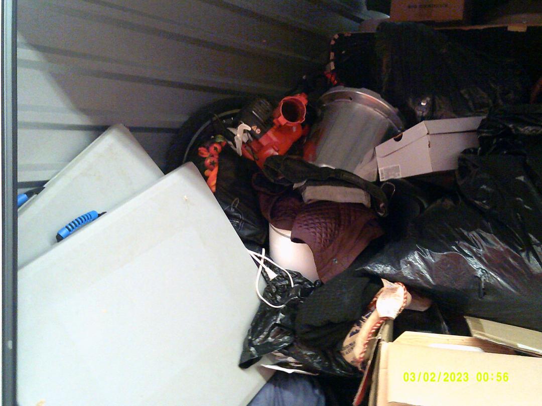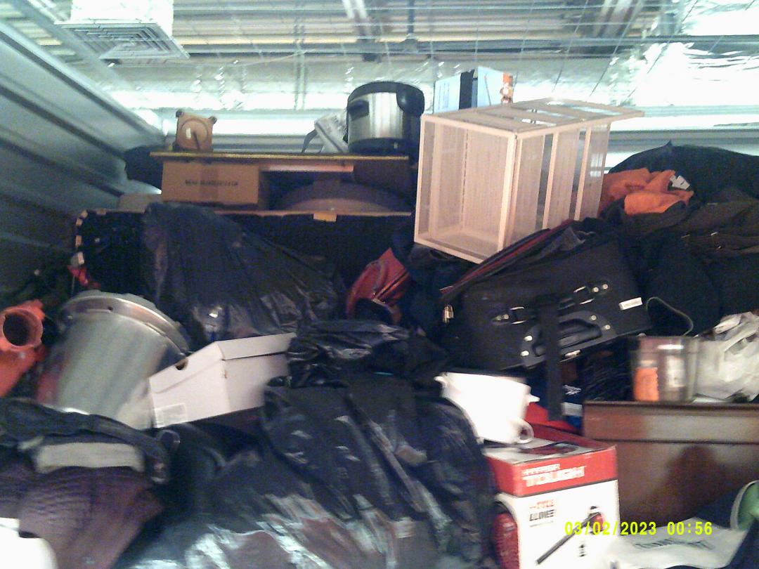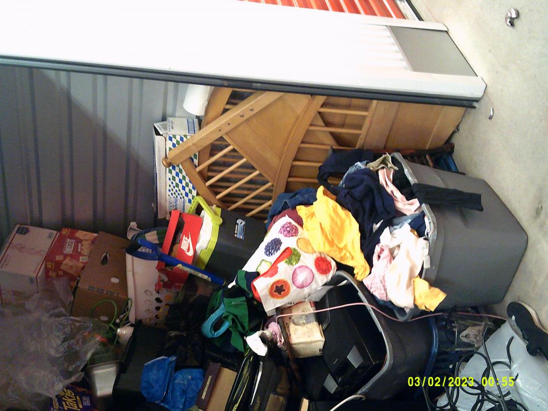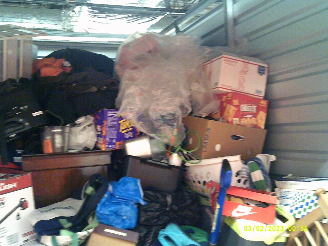 This unit appears to contain…READ ALL AUCTION RULES BEFORE BIDDING!!! Unit appears to contain: tables, a/c unit, chairs, speaker, bed frame , dresser, clothes, bags