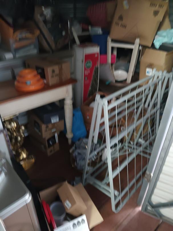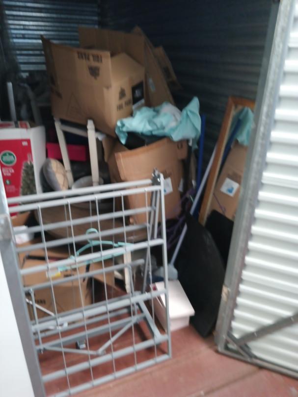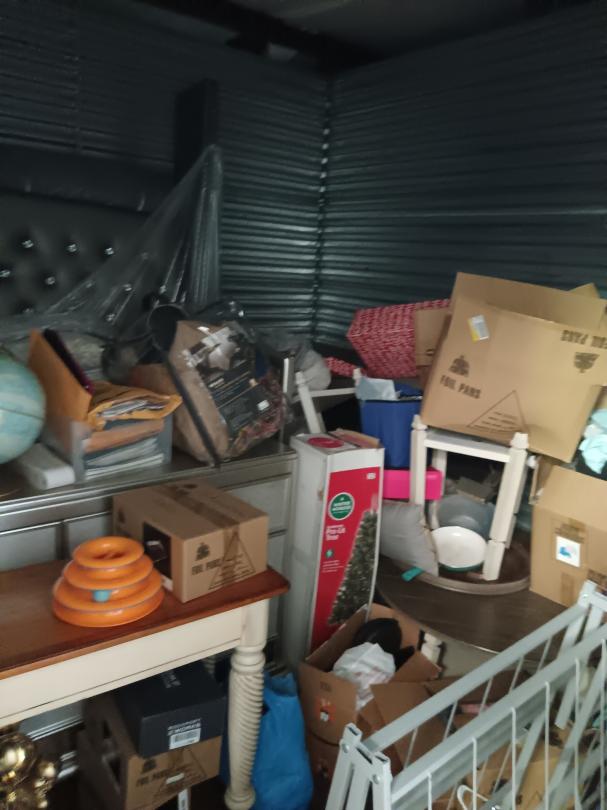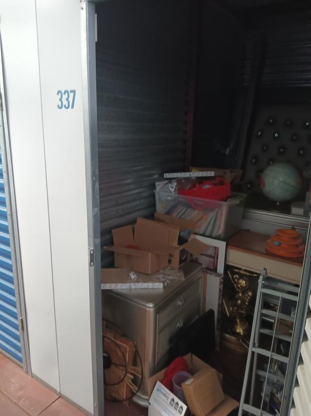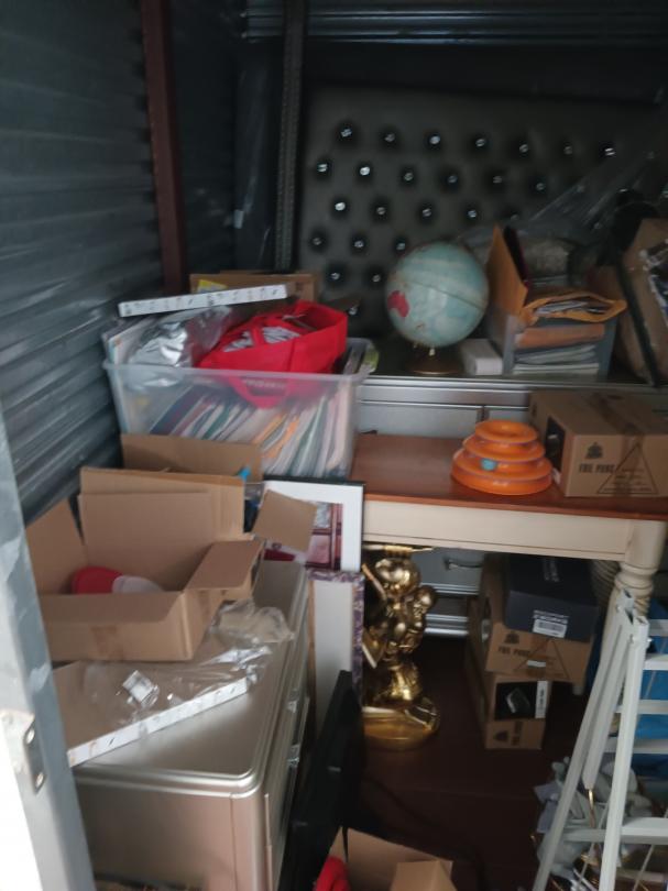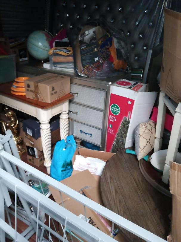This unit appears to contain…This 2nd floor unit has two doors and appears to contain : Art, Bags, Bedding, Books, Boxes, Buda Statue, Dresser, Globe, Headboard, Holiday Decor, Side Table Drawers, Tables, Totes, Misc. Items