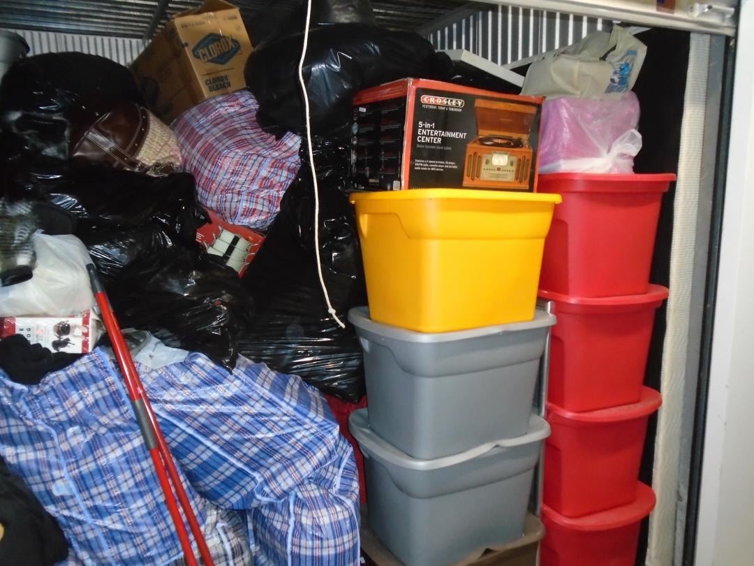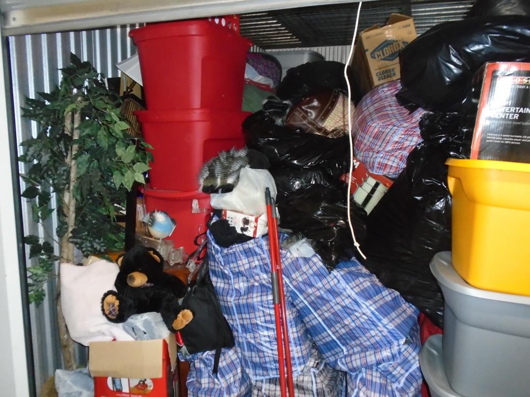 This unit appears to contain…Totes, Sofa, Bags, Mirror, Bags, Clothes, pots and Pans, Clock, Table, Chairs, Table, Vacuum.