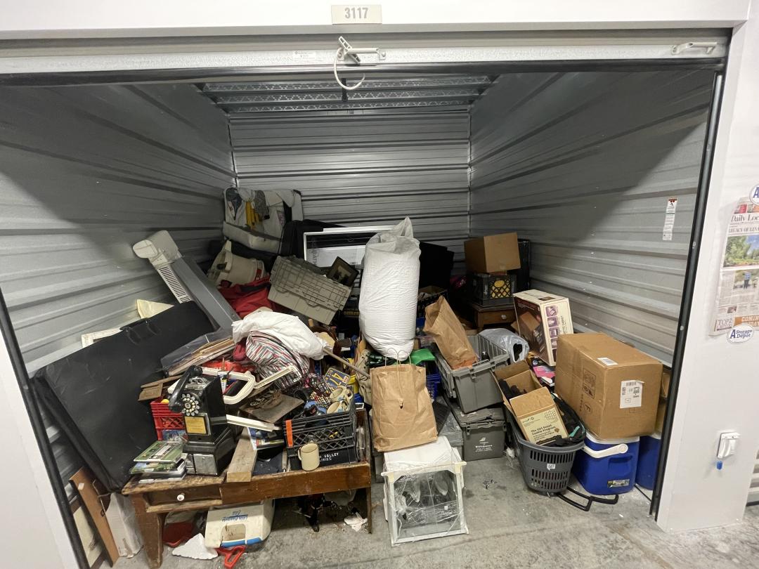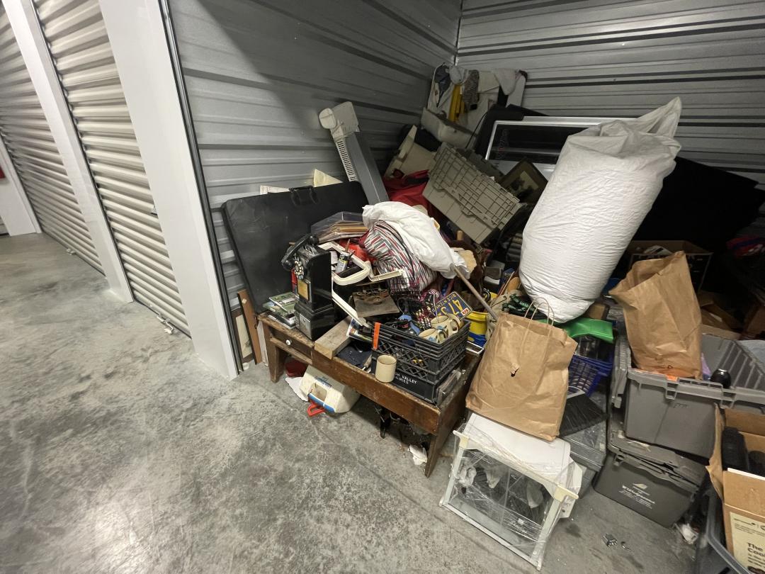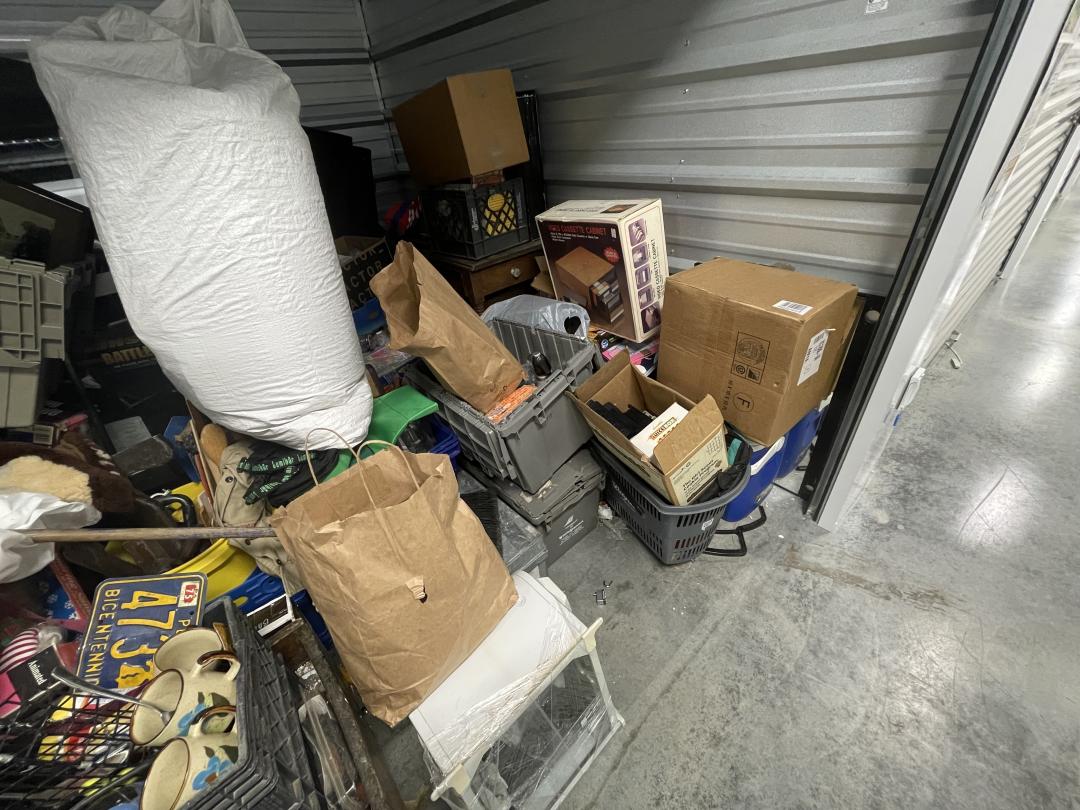 This unit appears to contain…Bags, Bedding, Boxes, Clothing, Desk, Couch, Table , Toys, Old Pay Phone, Basketball Backboard, Board Gamed Other