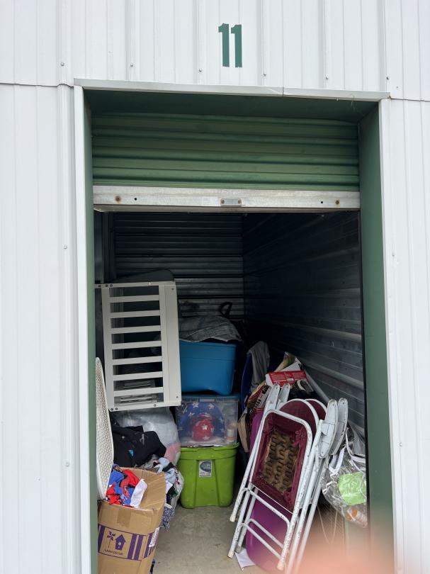 This unit appears to contain…Edison Self Storage Unit #11. Chairs, totes, baskets, boxes, fan and mis items.