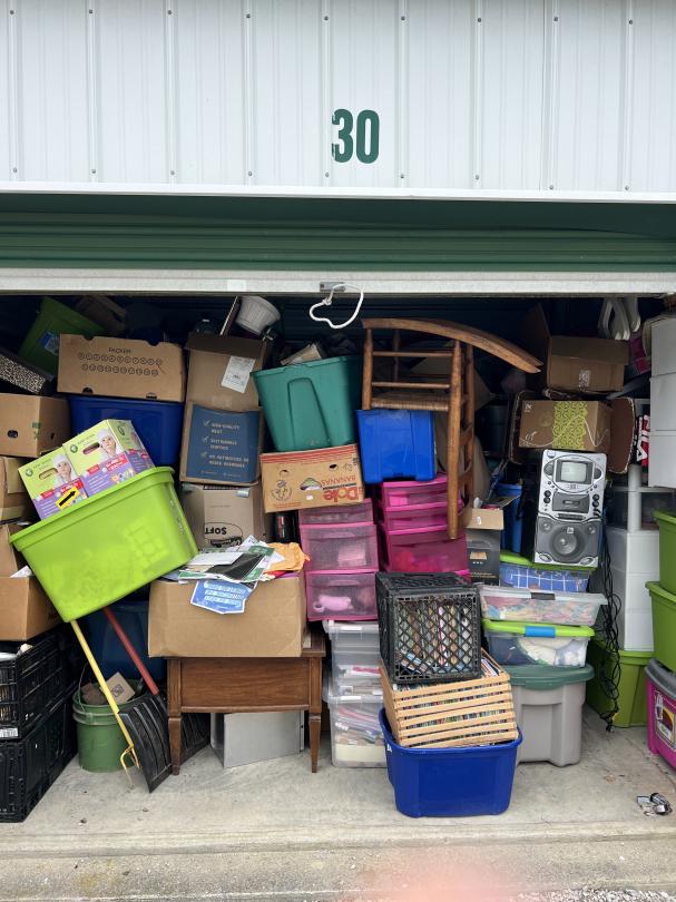 This unit appears to contain…Edison Self Storage Unit #30: Boxes, totes, radio, chairs, tools and mis items.