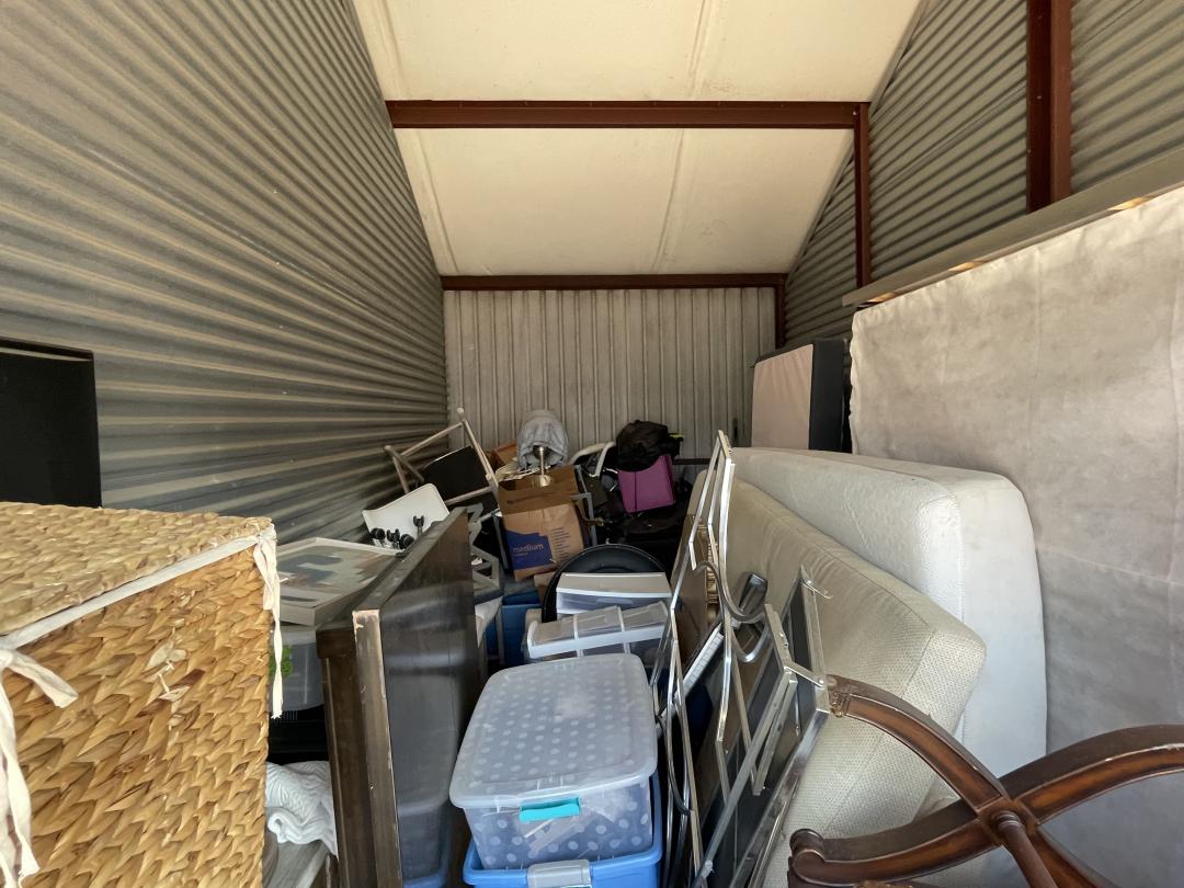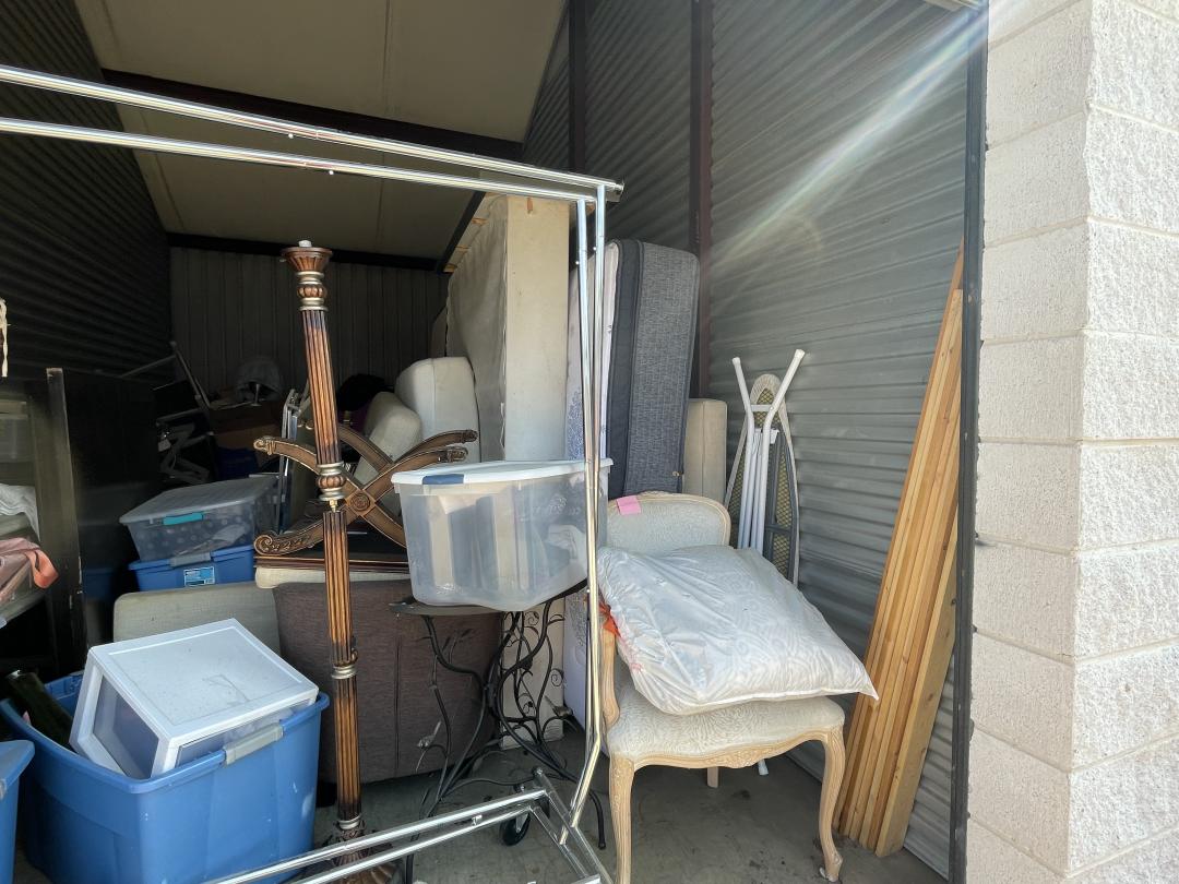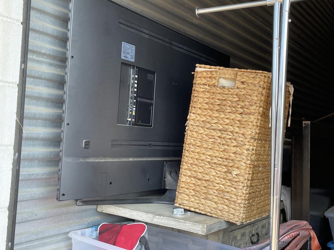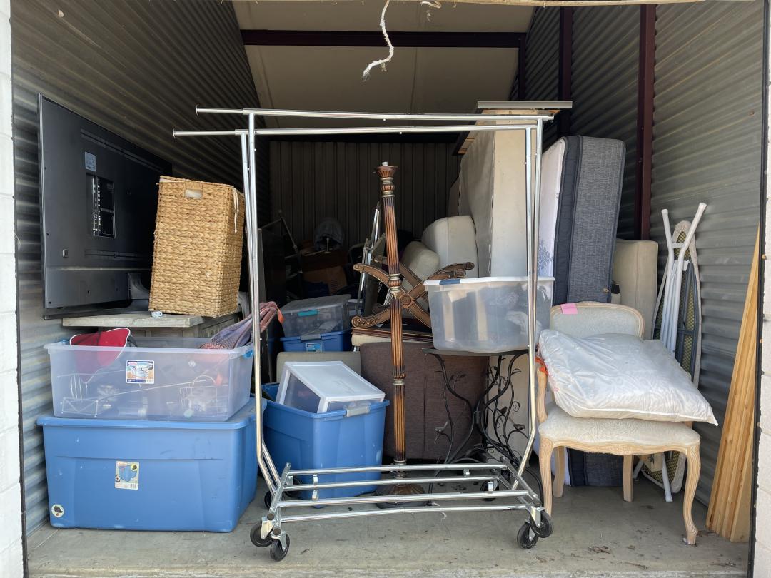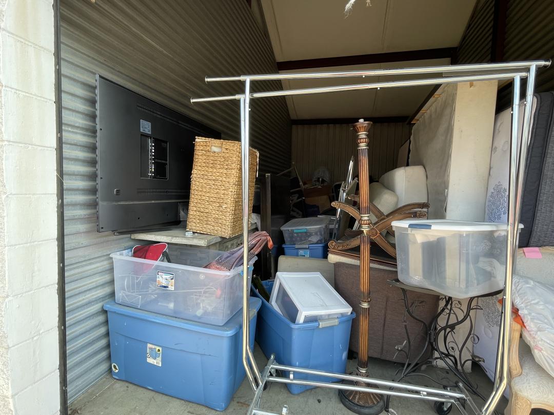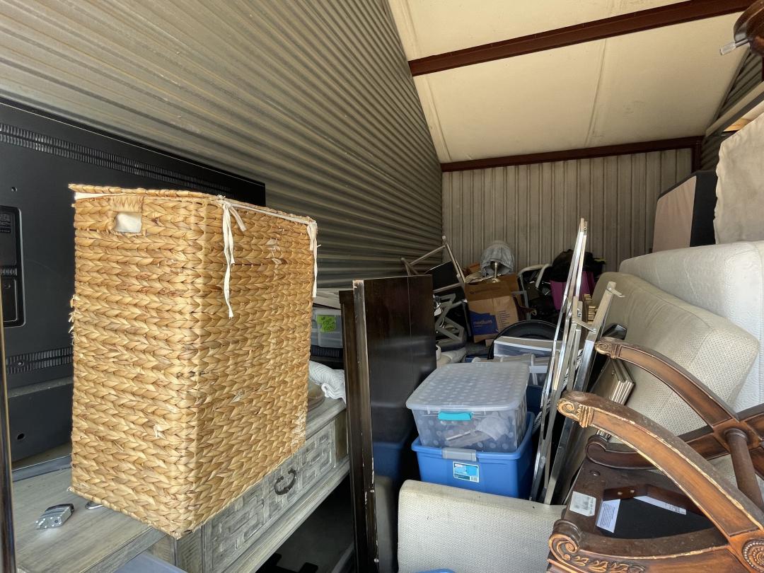 This unit appears to contain…flat screen TV, clothes rack, king mattress & box springs, 2 ottomans, sofa, chair, electronic keyboard, kitchen table, sofa table, accent table, 2 rolling chairs, wall pictures, lamp, wicker hamper, ironing board, miscellaneous totes