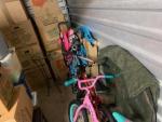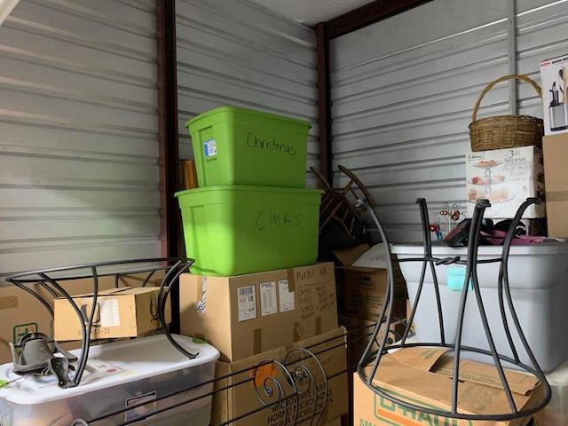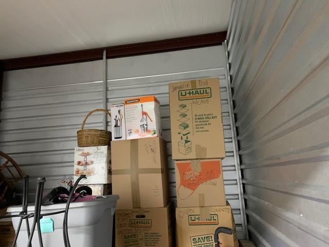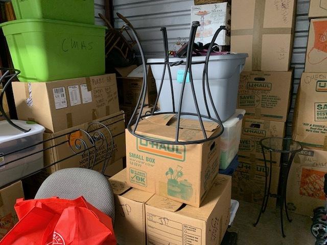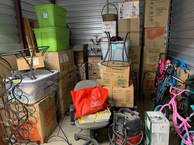 This unit appears to contain…Climate Controlled Upper Floor compressor, 2 baby stroller, 2 children's bikes, wine rack, glass top coffee table, office chairs, magazines, wicker basket, trunk, child rocker, citrus press, totes , ceiling fan , shelving. boxes are labeled with what is in them.