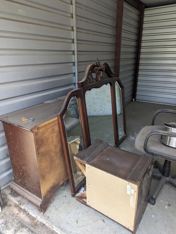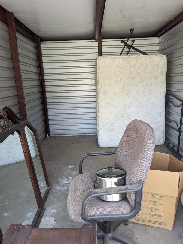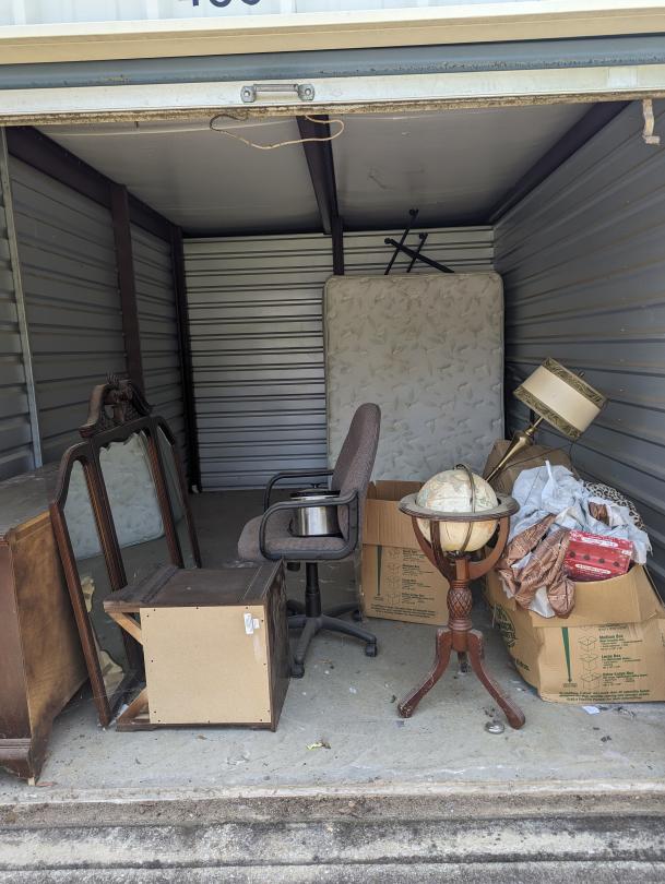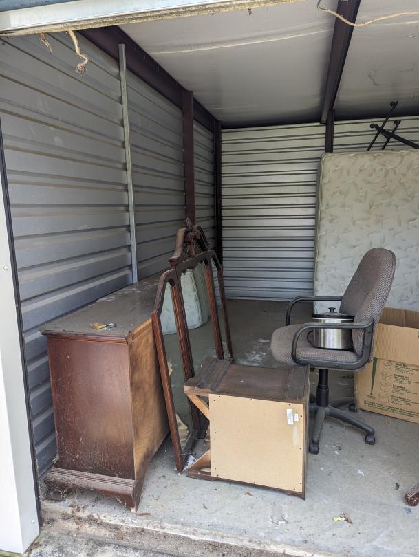 This unit appears to contain…Swivel Chairs,Mattresses,Box Springs,Dressers or Armoire,Nightstands,Lamps,Chairs,Misc. Boxes,Misc. Items