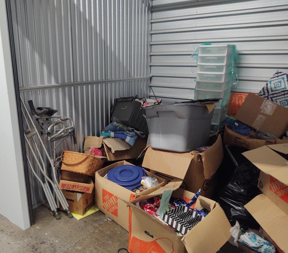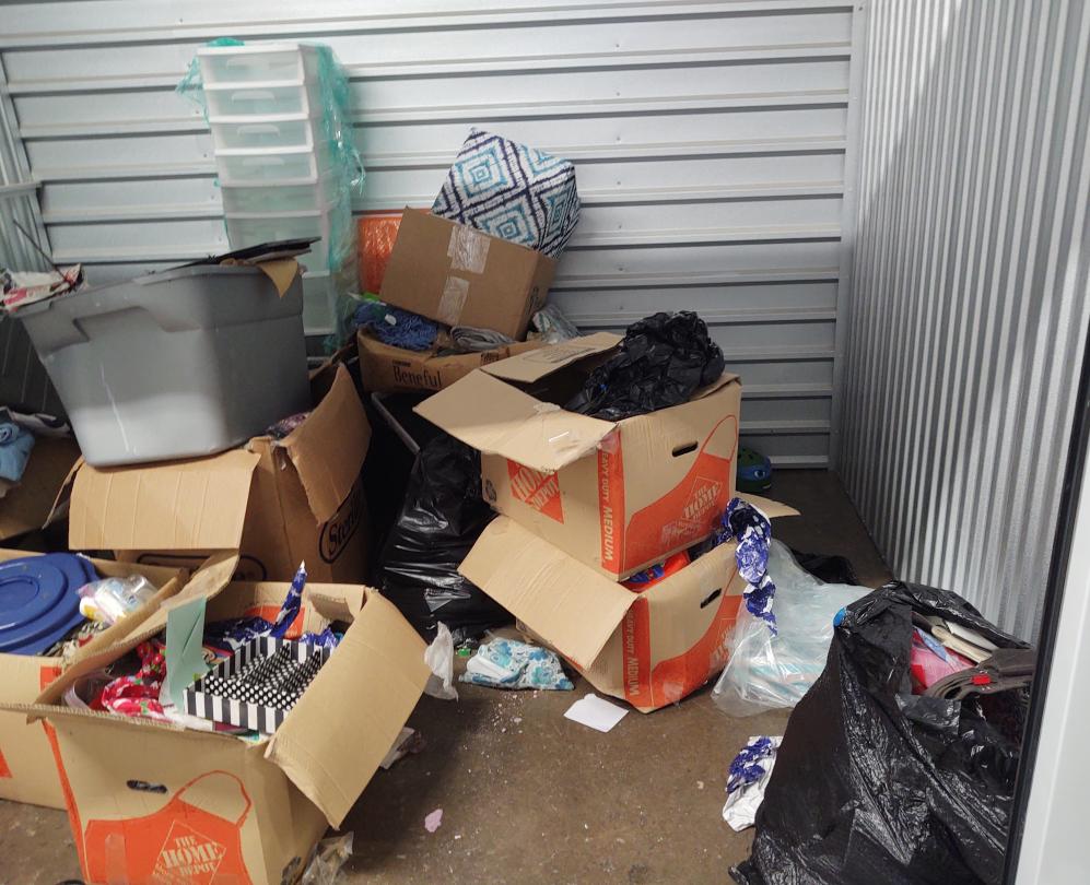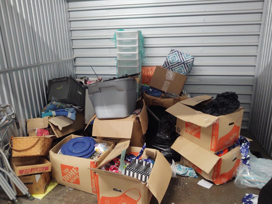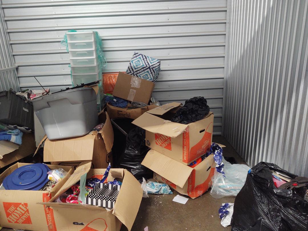 This unit appears to contain…Boxes, Clothes, Plastic Organizers, Toys