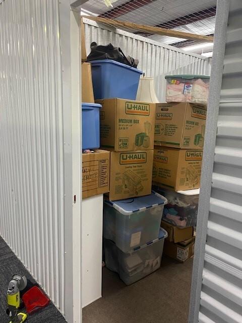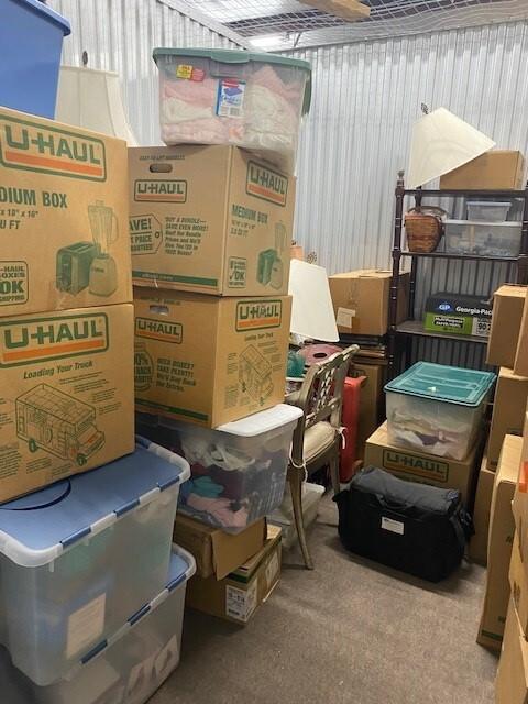 This unit appears to contain…Unit appears to contain: Bags, Baskets, Boxes, Chair, Desk, Lamp, Pictures, Shelf, totes, Quilt