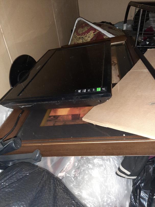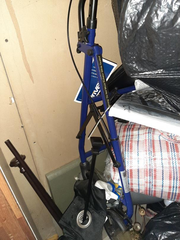This unit appears to contain…Unit appears to contain, fish tank, Bags, Clothes, new walker, rug, boxes, lamp, comforter, blankets.