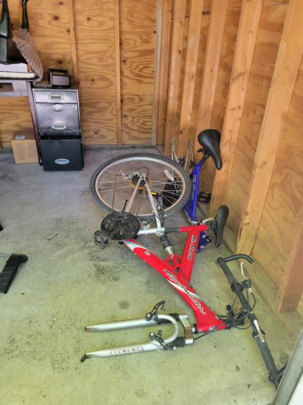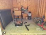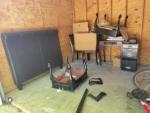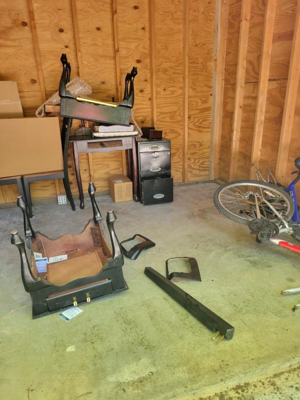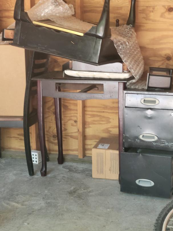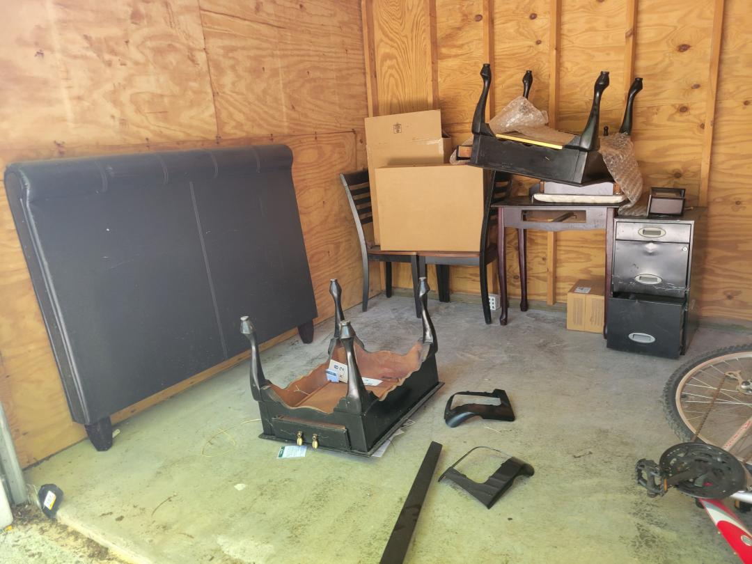 This unit appears to contain…2 small end tables, another small table, bicycle parts, chairs, what looks like a headboard, small file cabinet