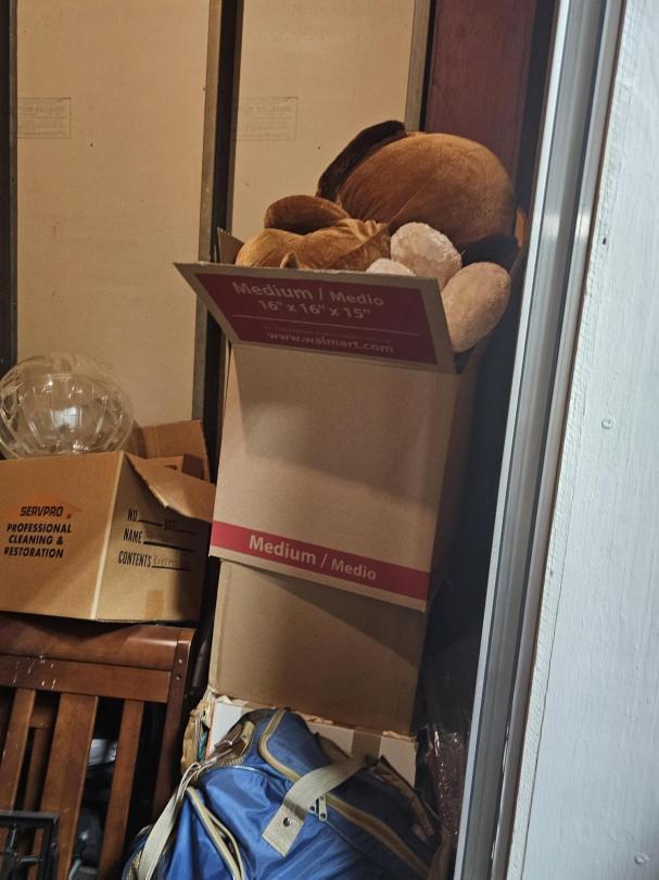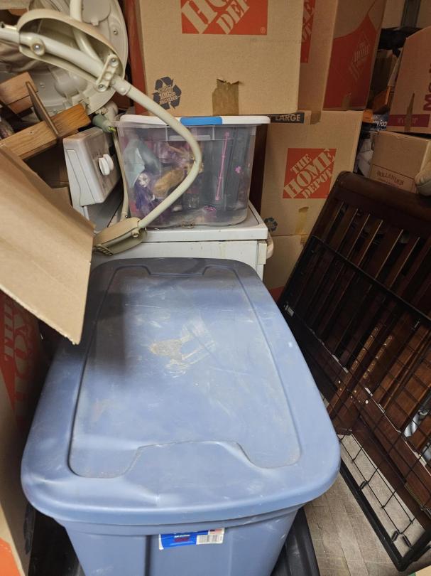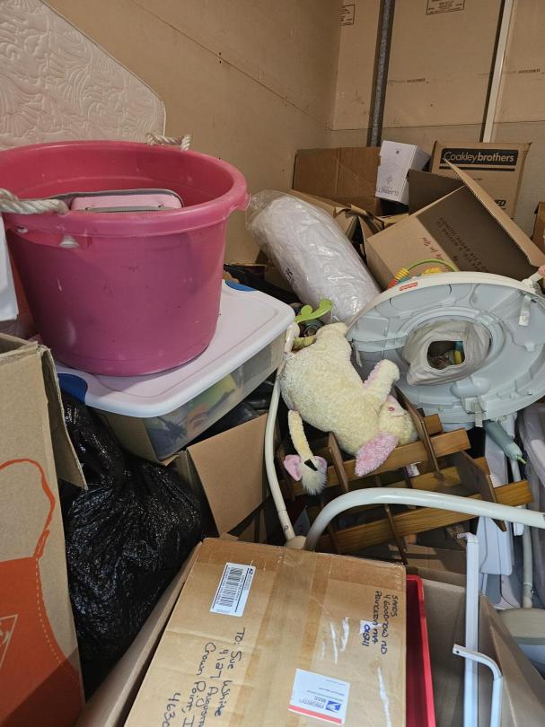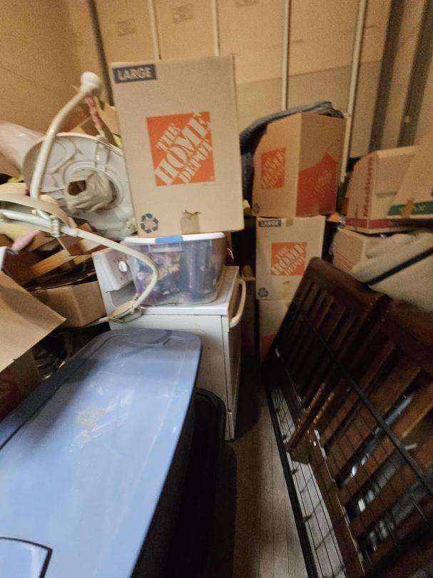 This unit appears to contain…Unit appears to contain, BED FRAME, TOTES, BOXES, WASHER, STOVE, KIDS TOYS