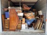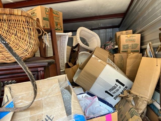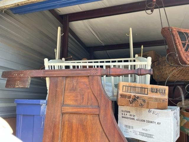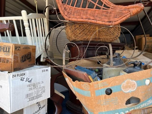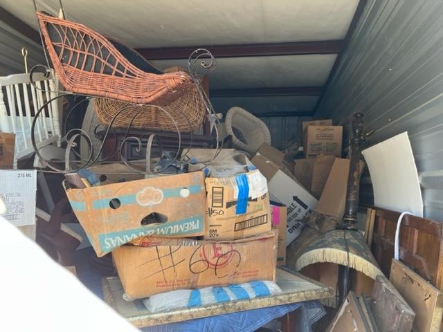 This unit appears to contain…Self Storage 2 Headboards, Floor Lamp, Baby Cradle, 2 Nightstands, Outdoor White Wicker Seating Set with Cushions, Computer Desk, Christmas Slay, Dinning Table with 6 Chairs, Kids Bouncy Horse, Nightstand, A lot of Hanging Wall Art, Boxes, Totes, Jugs, Mirror, Pull Handles for a Bed.