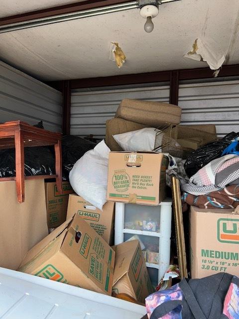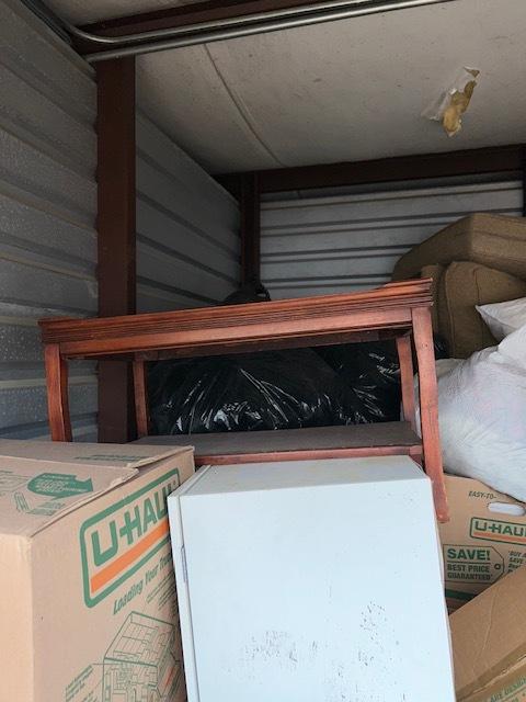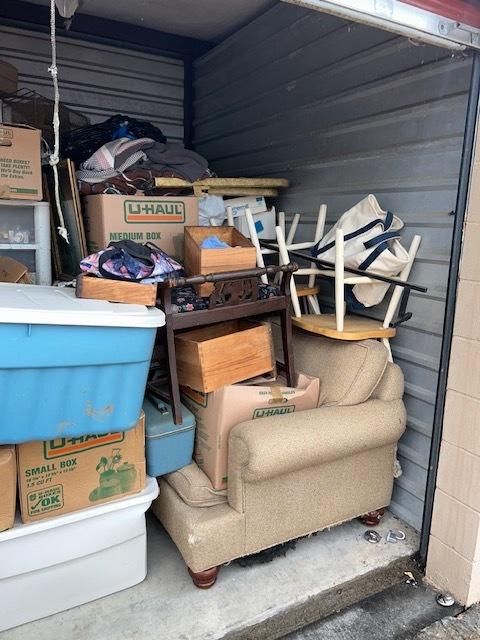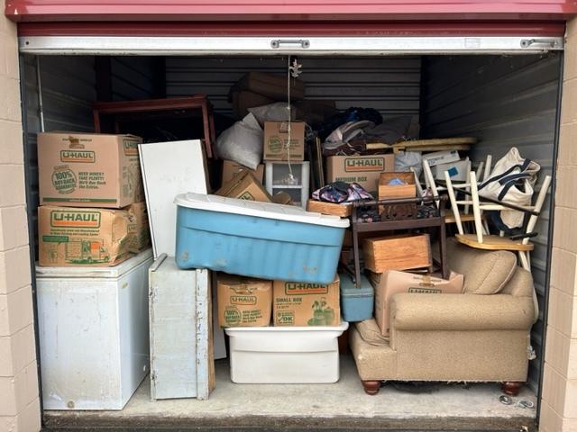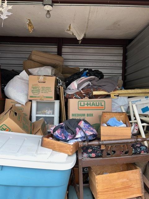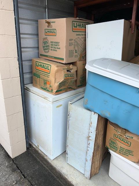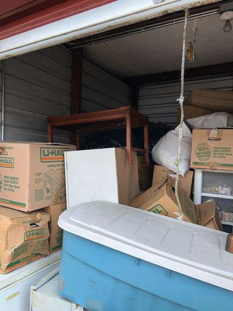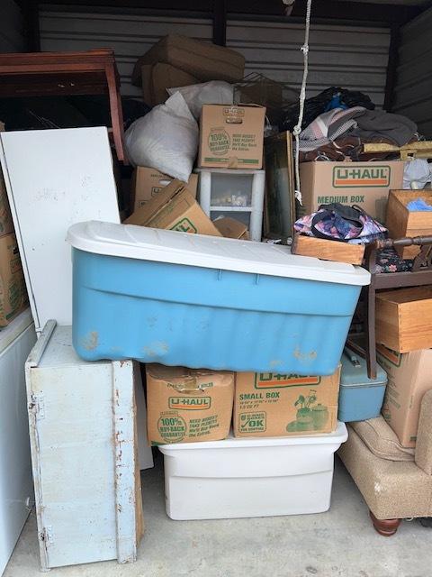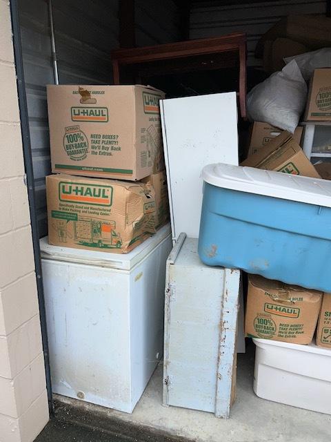This unit appears to contain…This unit may contain: deep freeze, boxes, totes, couch, kitchen chairs, bags, table, blankets, plastic organizers, and other misc items.