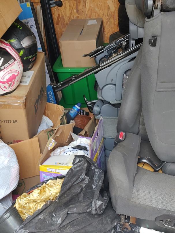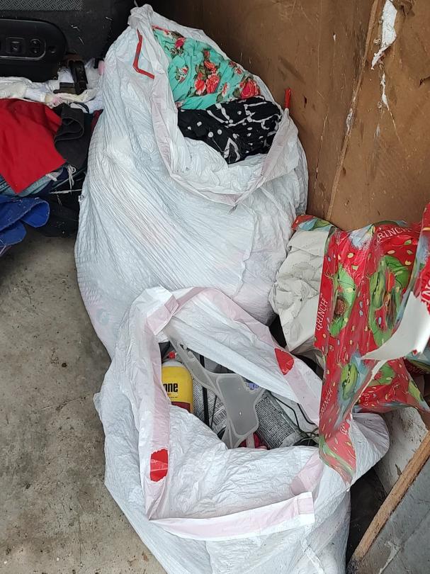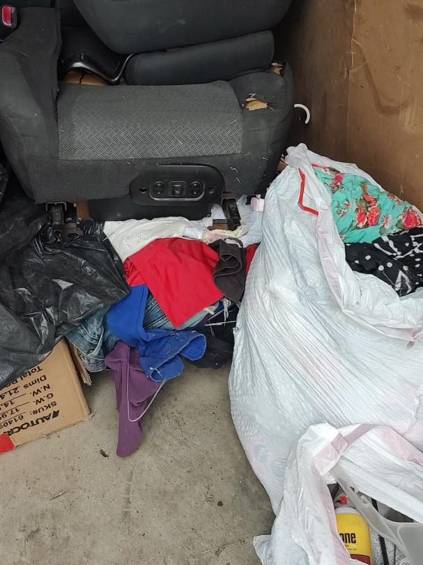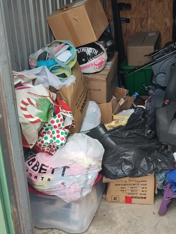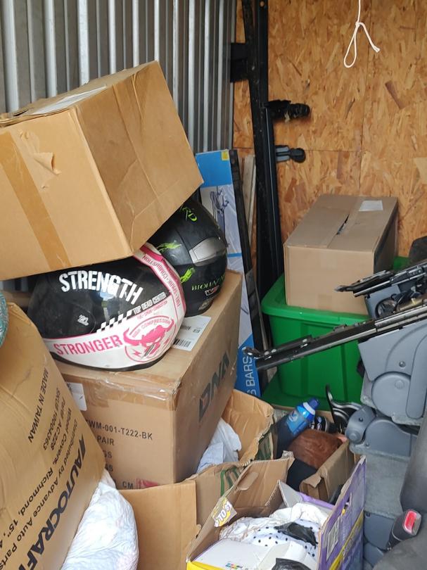 This unit appears to contain…This unit appears to contain auto seats, bags, plastic containers, boxes, clothing, helmets, bed railings and miscellaneous items.