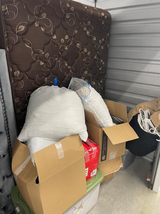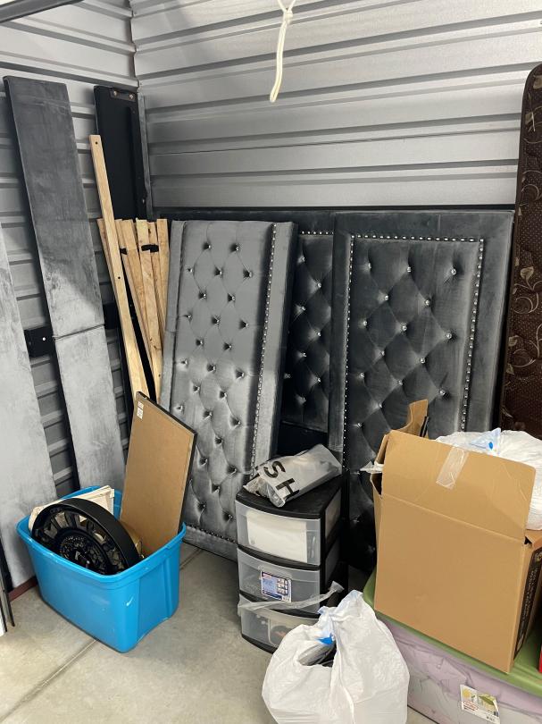 This unit appears to contain…5X10 Climate Controlled unit with bed frame, household items, clothes, dishes, pot and pans.