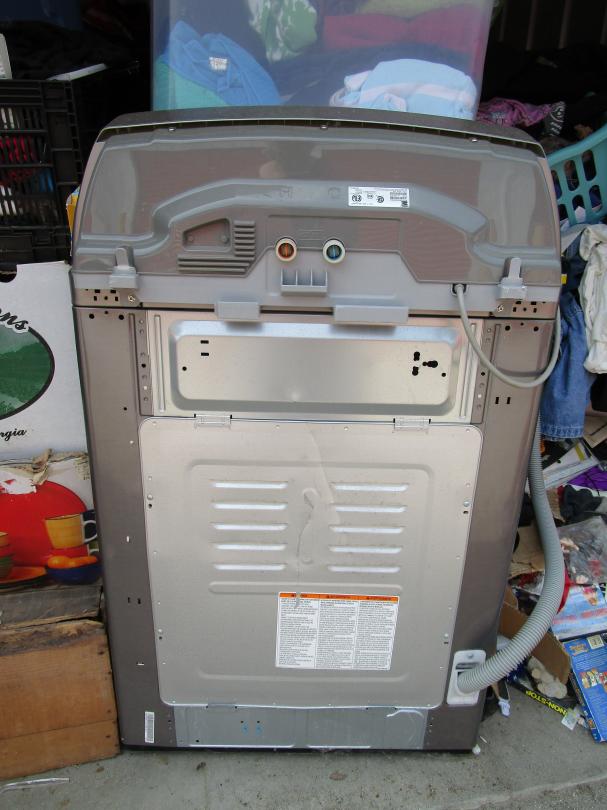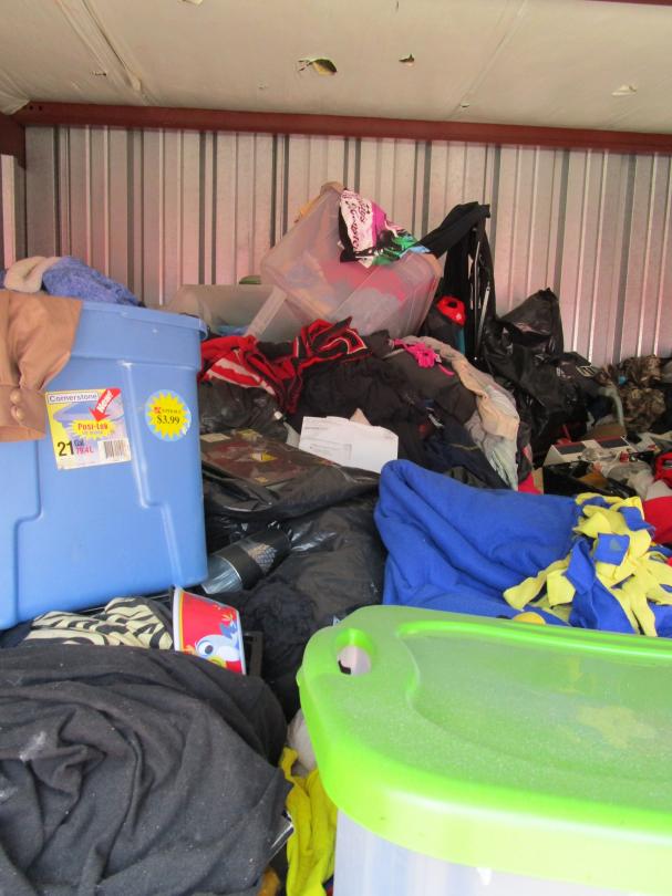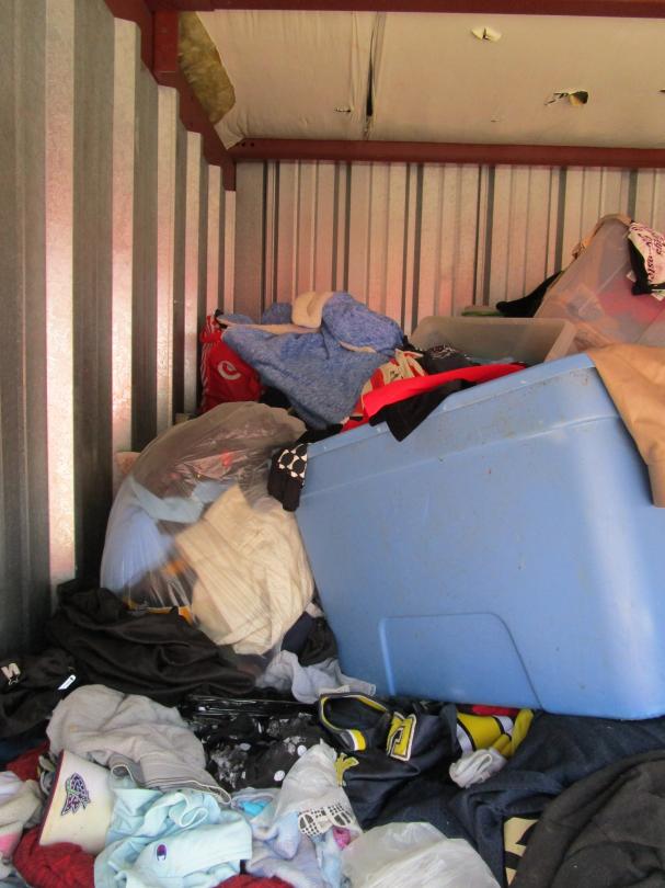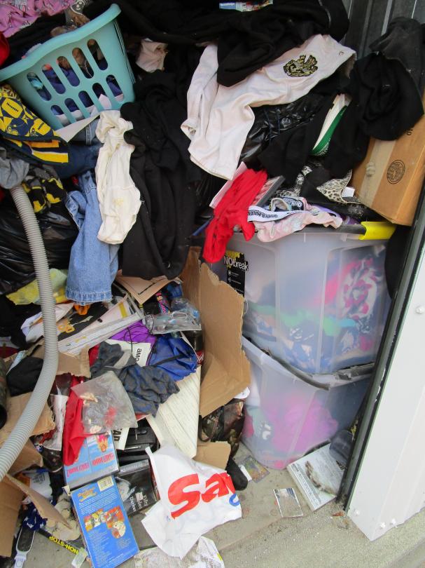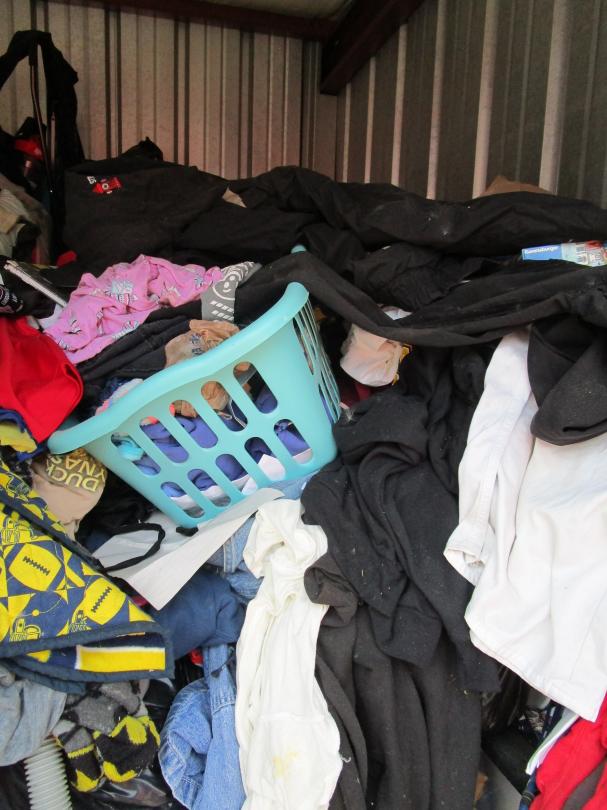 This unit appears to contain…Washer, clothes, vacuum, books, 5+ totes, radio, shoes, dryer, games