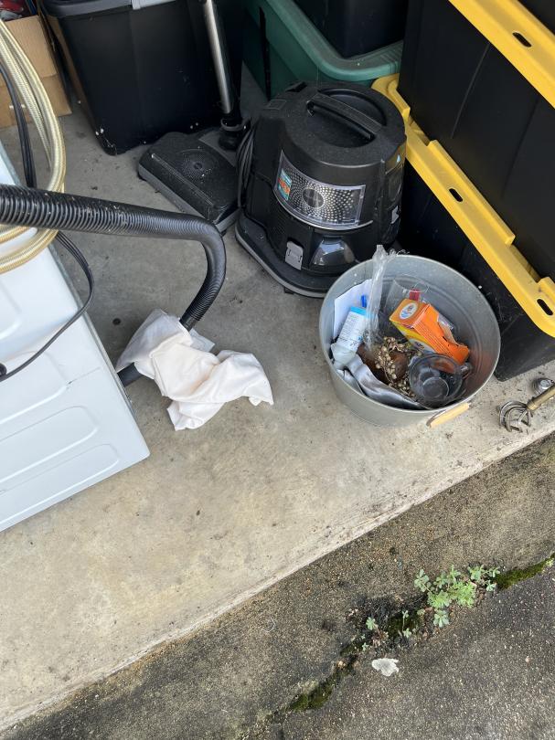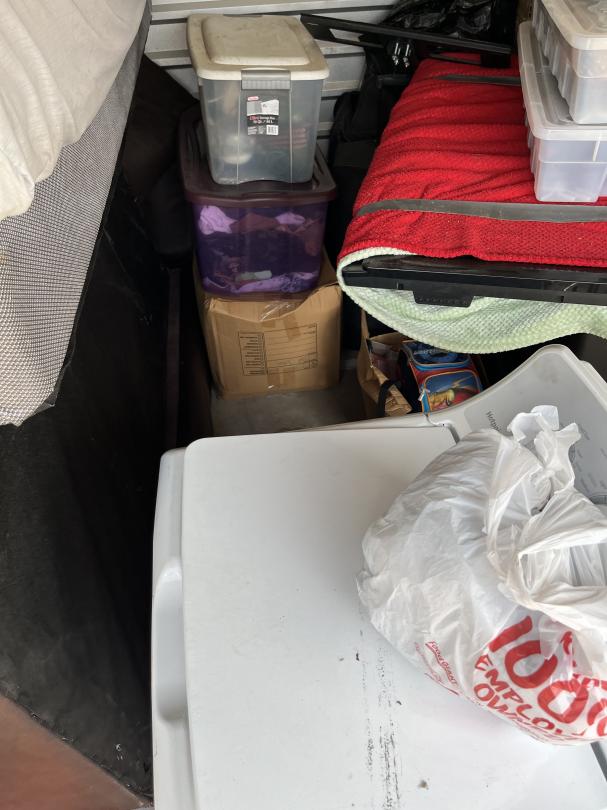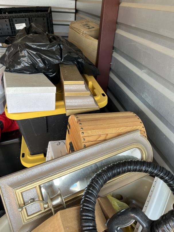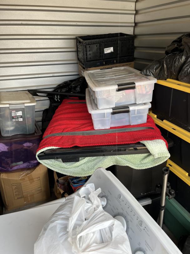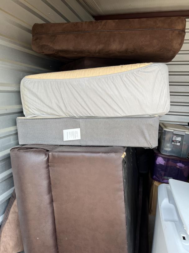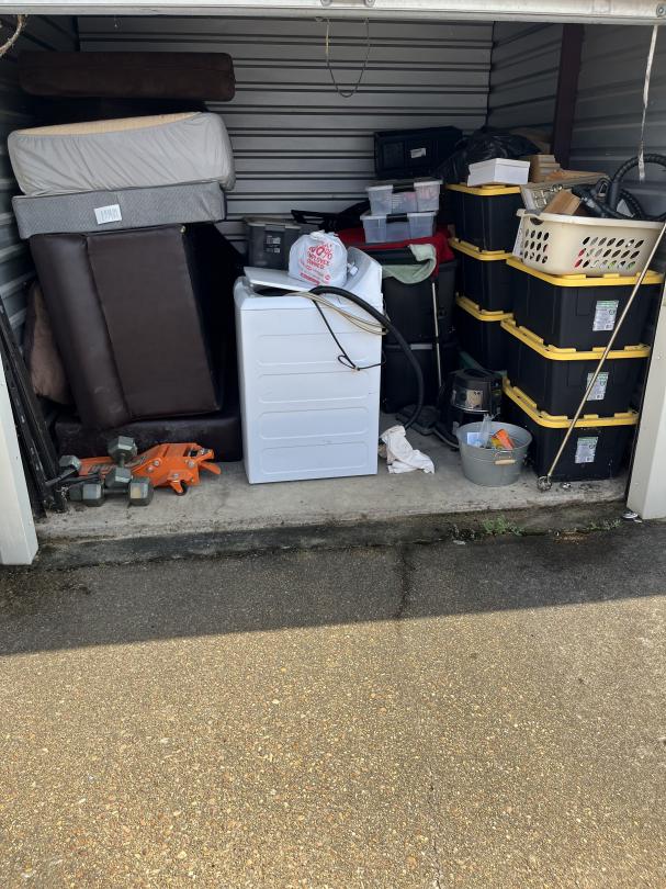 This unit appears to contain…Drive-Up Storage TV, totes, washer, mattresses, car jack, vacuum, boxes, couch, bed frame