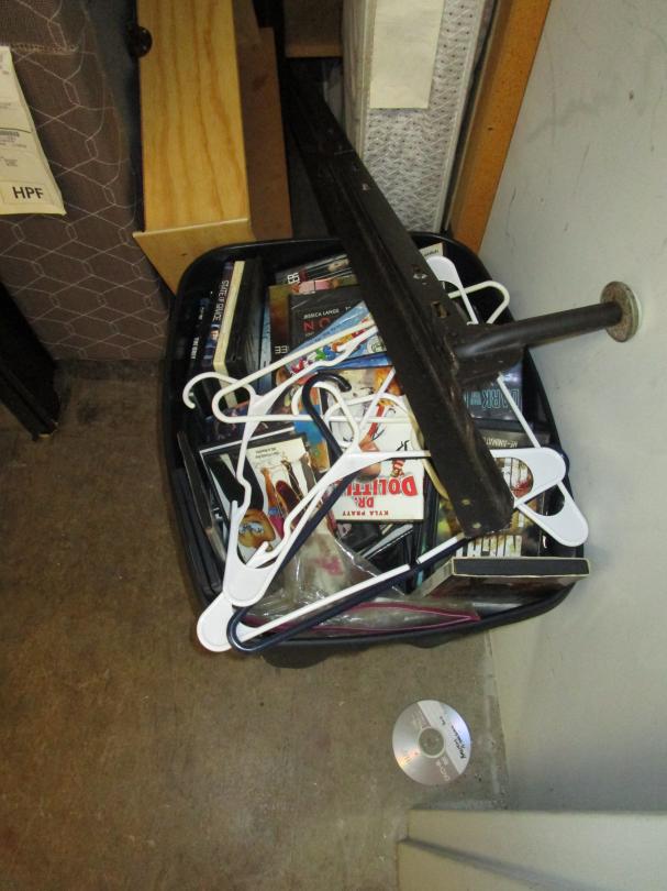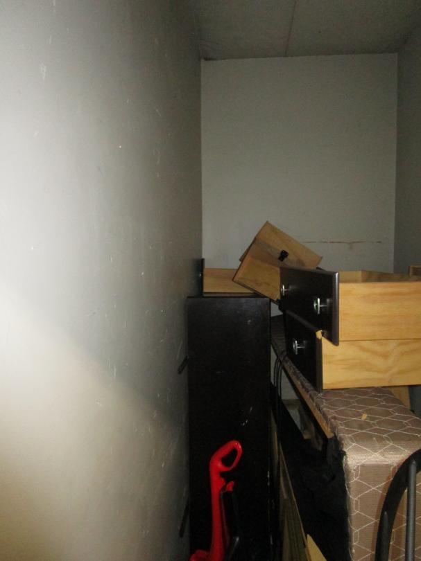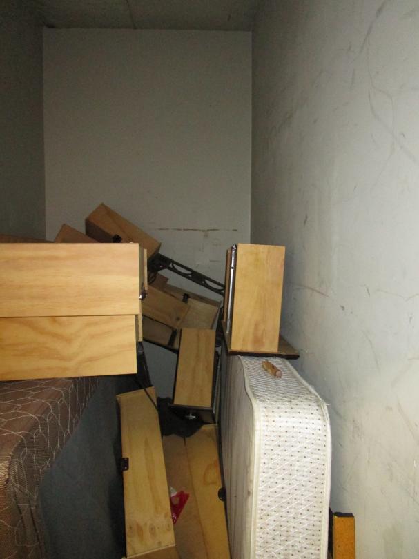This unit appears to contain…Corner shelves, mattress, DVD's, chest of drawers, vacuum, wall art, bed frame, metal console table, headboard