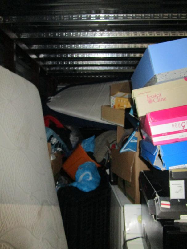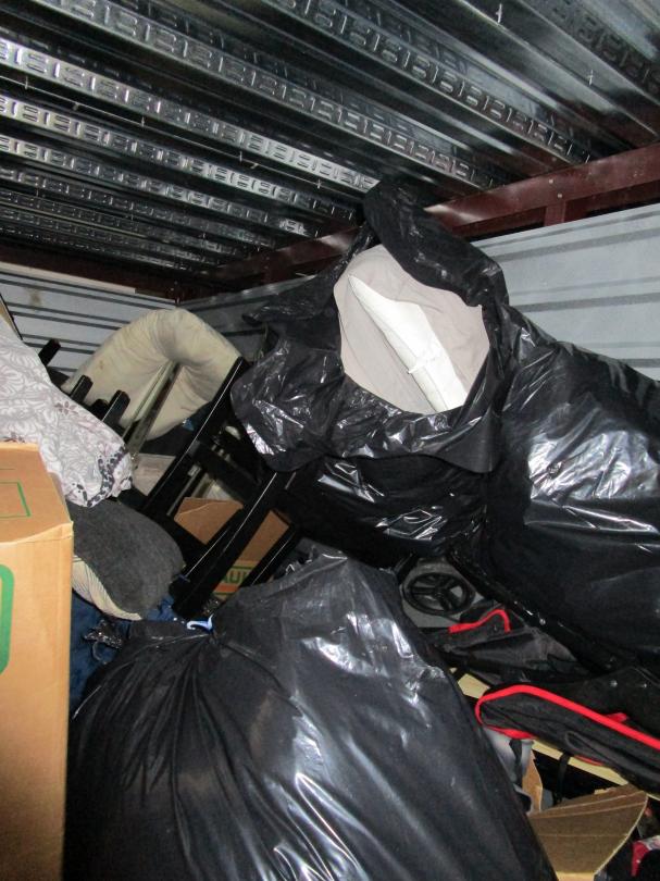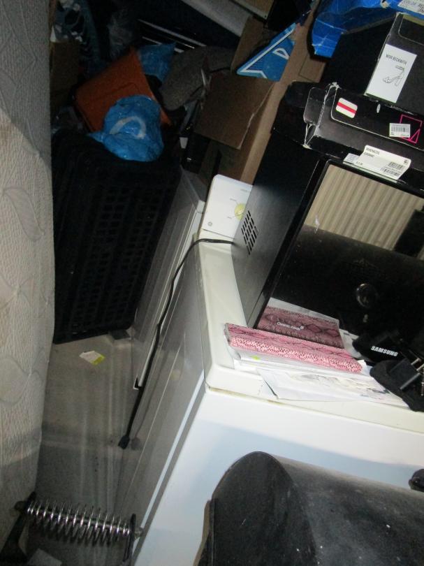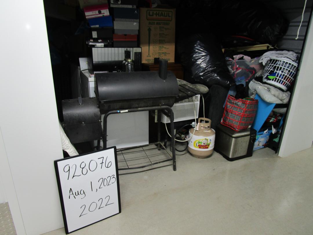 This unit appears to contain…Washer, dryer, smoker, propane tank, window ac, microwave, chest of drawers, sofa, 2 mattresses, 5+ boxes, 5+ bags, clothes, shoes, stools