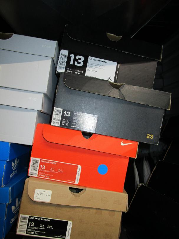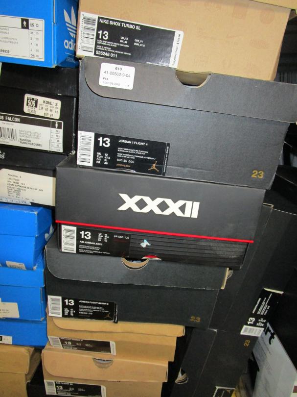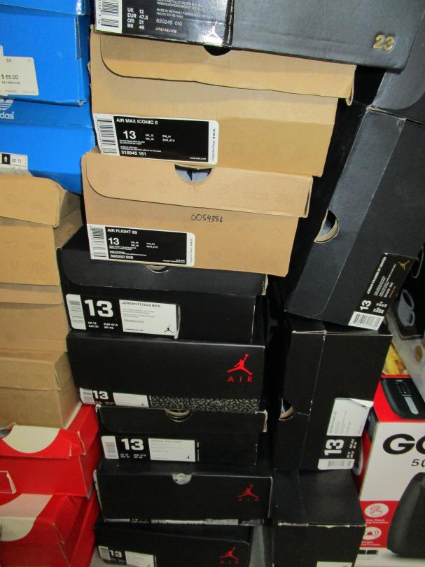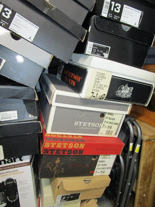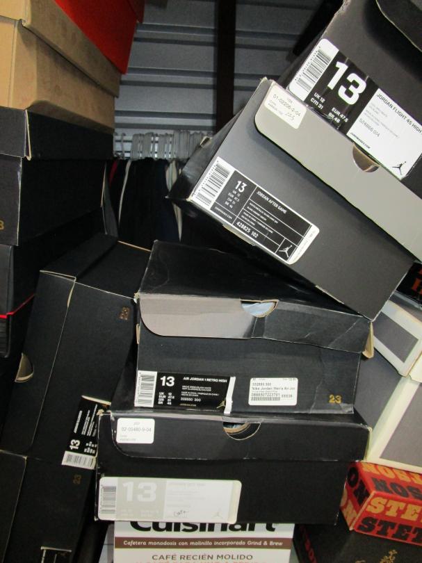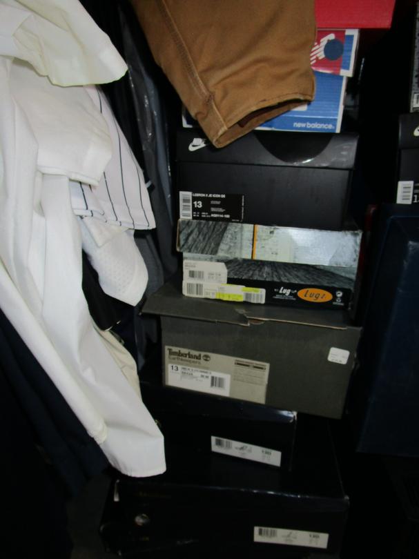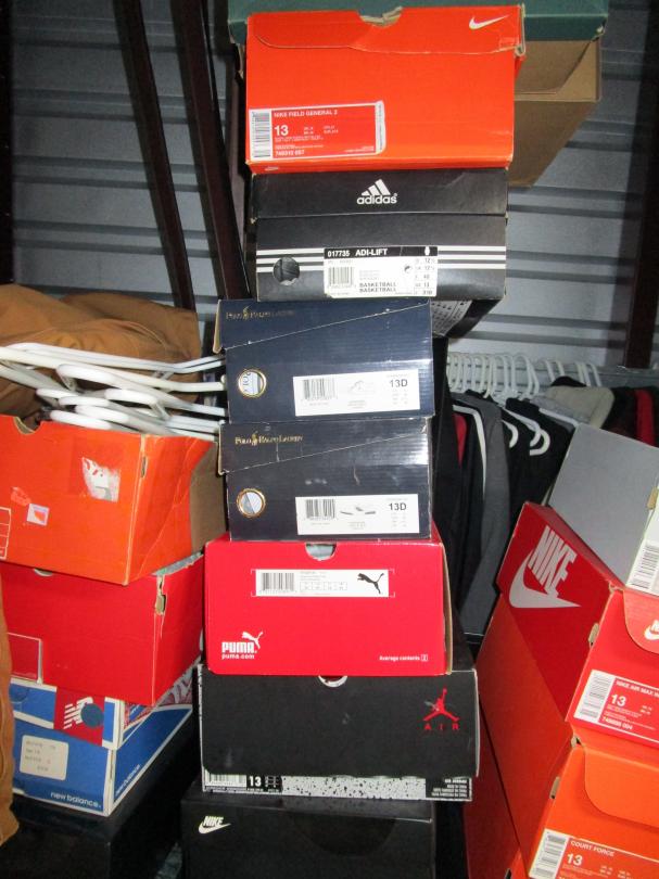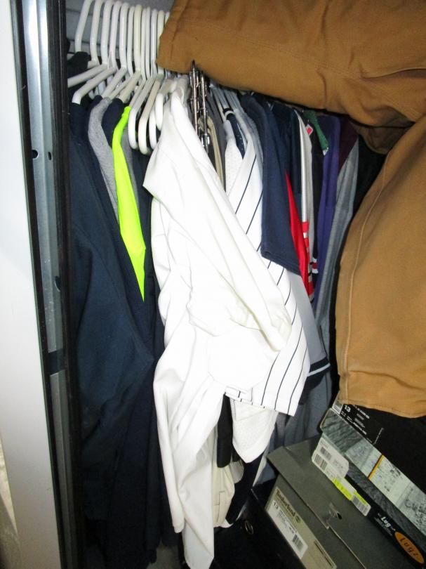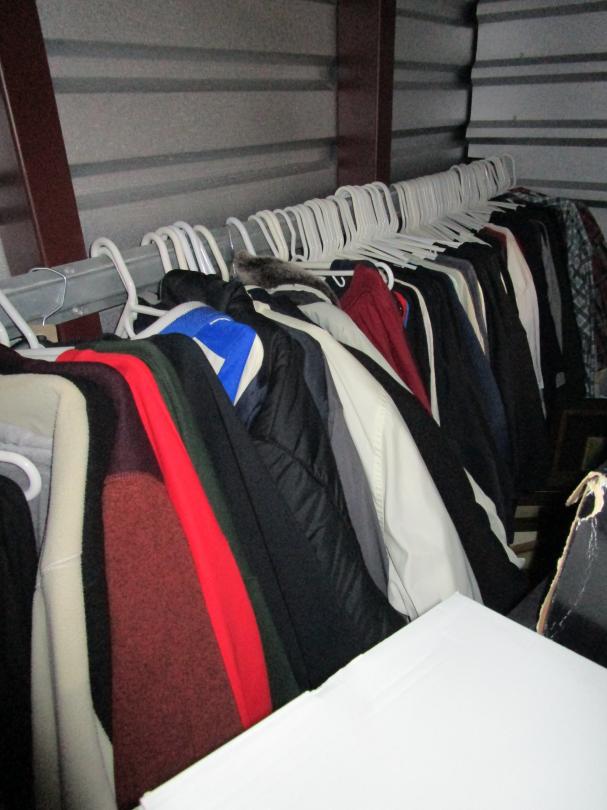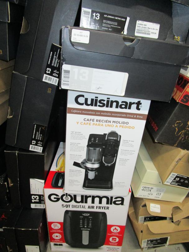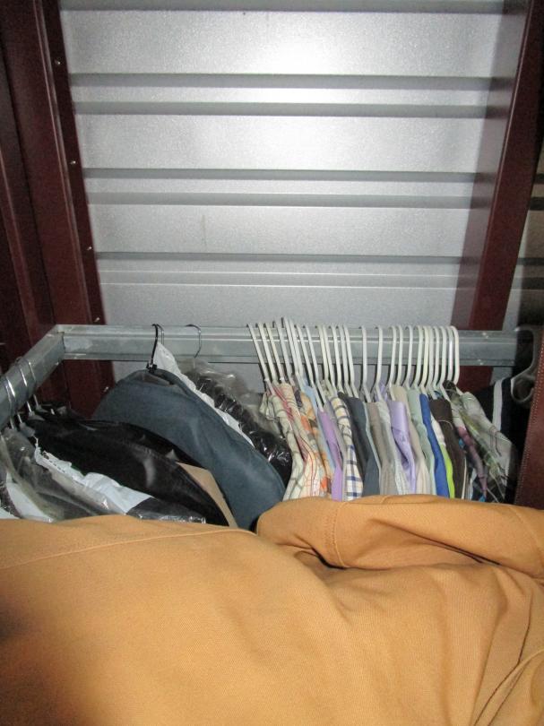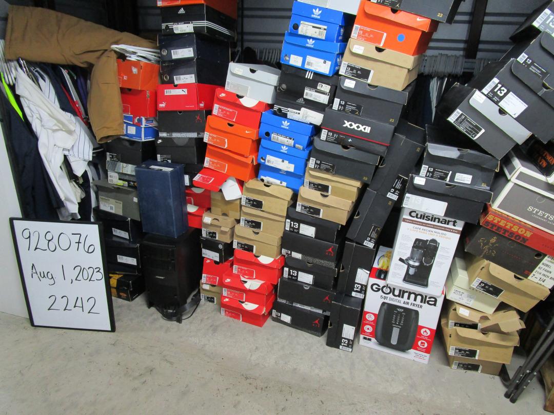 This unit appears to contain…Clothes, Cuisinart, air fryer, folding chairs, camping chairs, wall clock, shoes