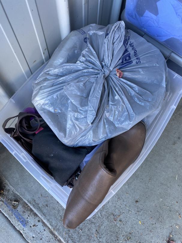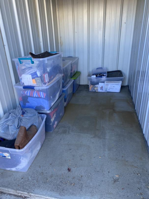 This unit appears to contain…Drive Up Totes, Shoes, Papers and Clothing