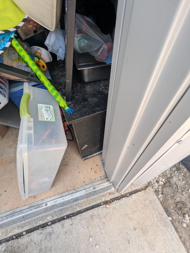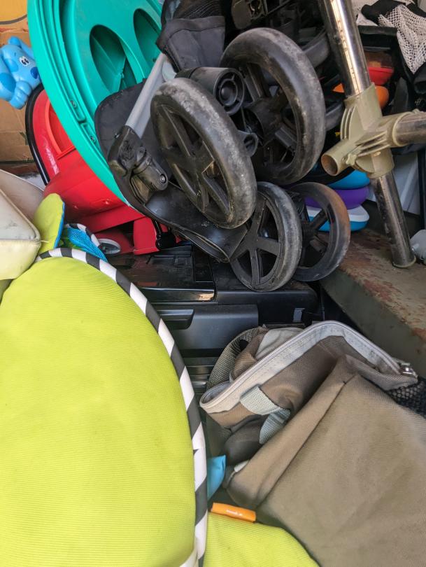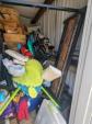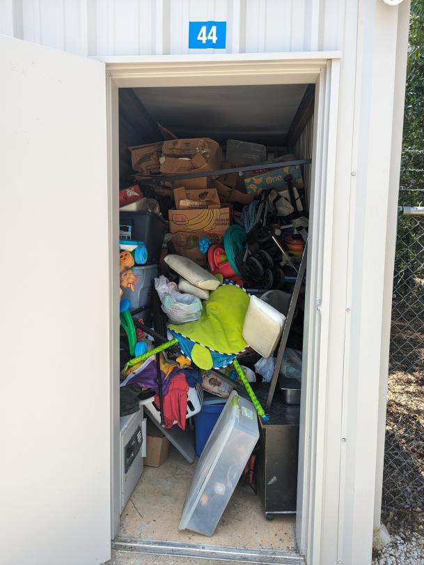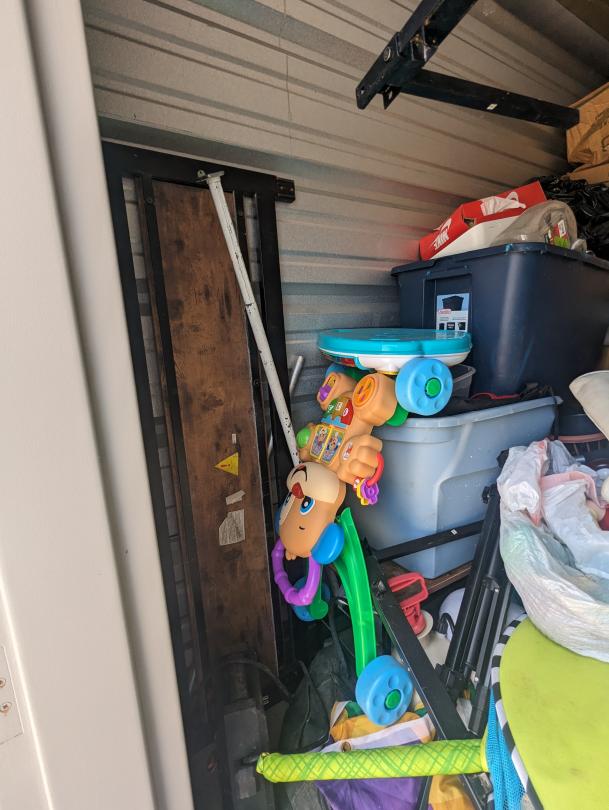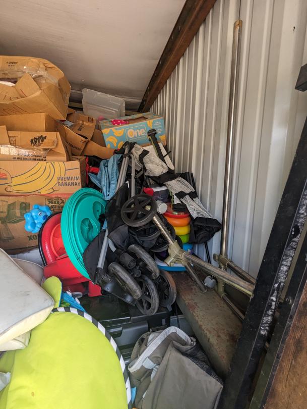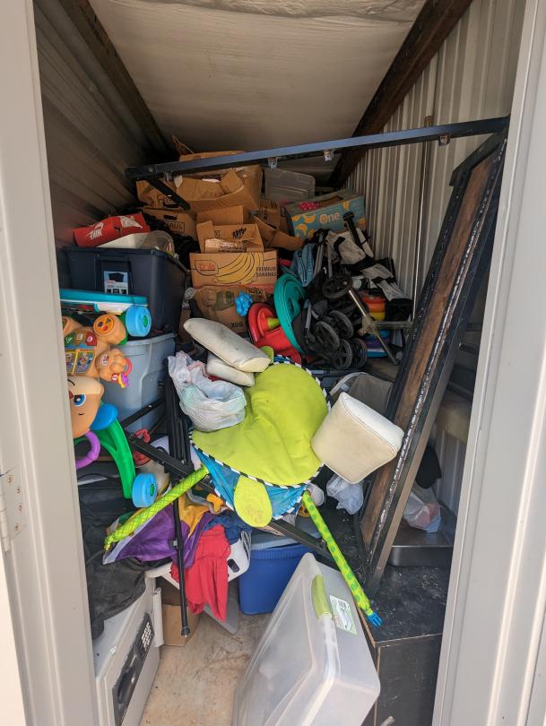 This unit appears to contain…Plastic Containers, Toys, Furniture, Safe, Baby Stroller, Headboard, Electronics,