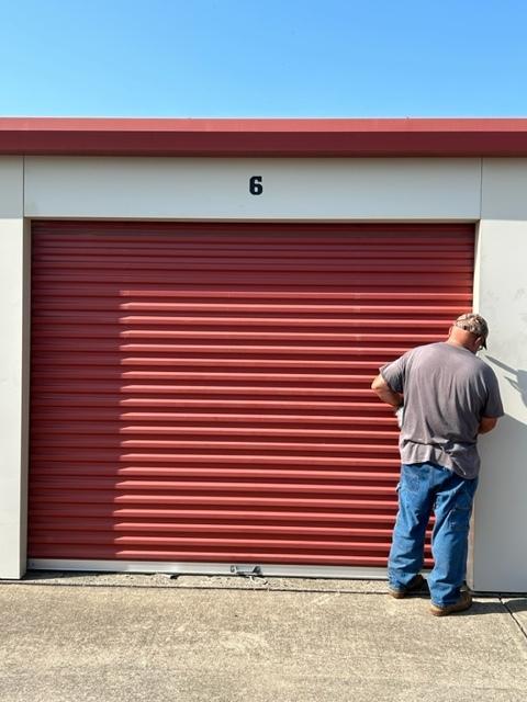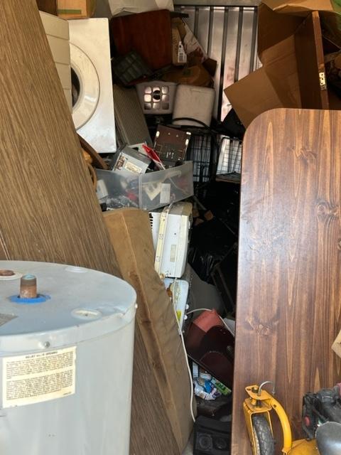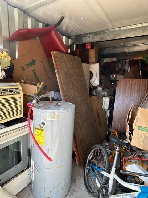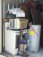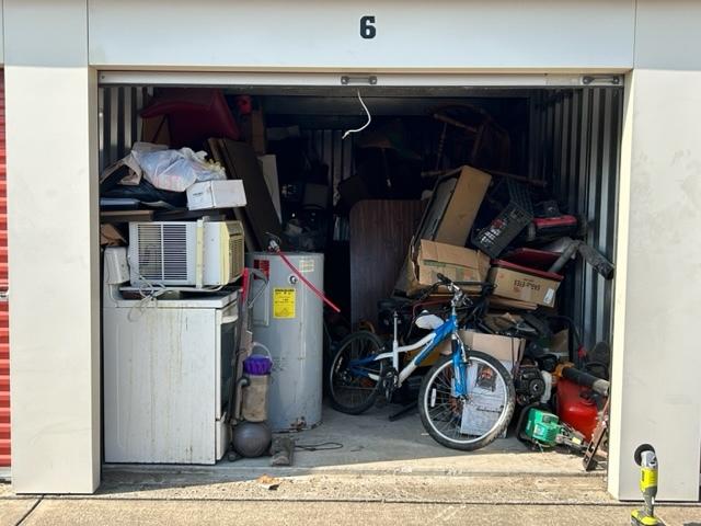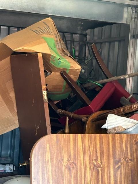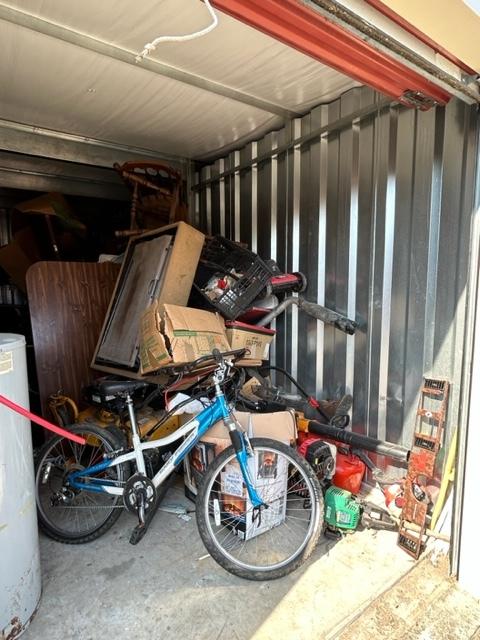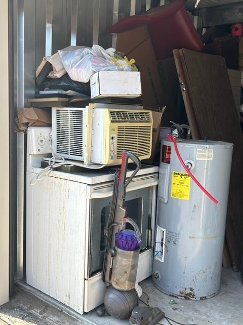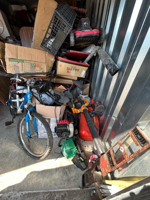 This unit appears to contain…ac window units, stove, bike, tables, chairs, water heater, vacuum, boxes, door, lawn mowers (gas and electric), ottoman/hide a bed, fan, propane tank, weed eater, gas leaf blower, hedge trimmer, gas tank, muffler, toys, pet cages, speakers, rims, boots.