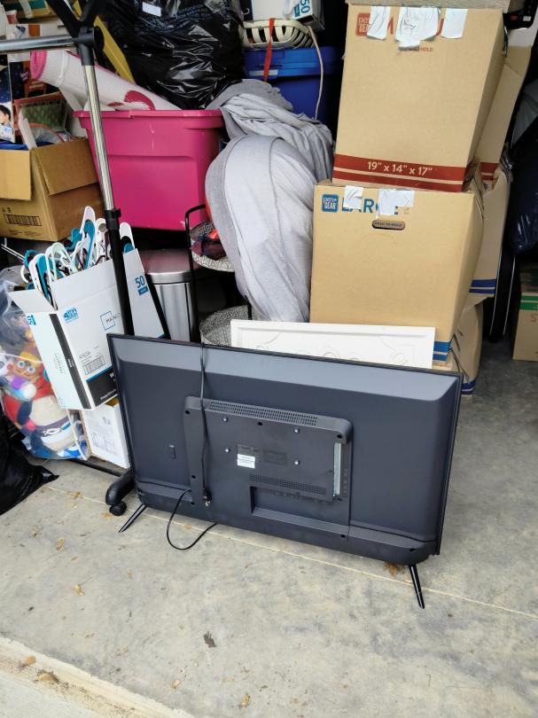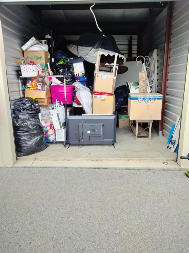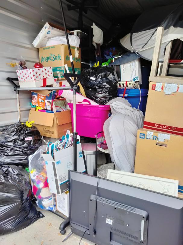 This unit appears to contain…tv, furniture, boxes, totes, bags, tables, microwave, air hockey table, mattress, box springs