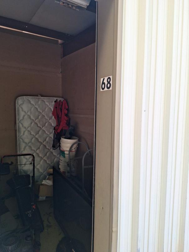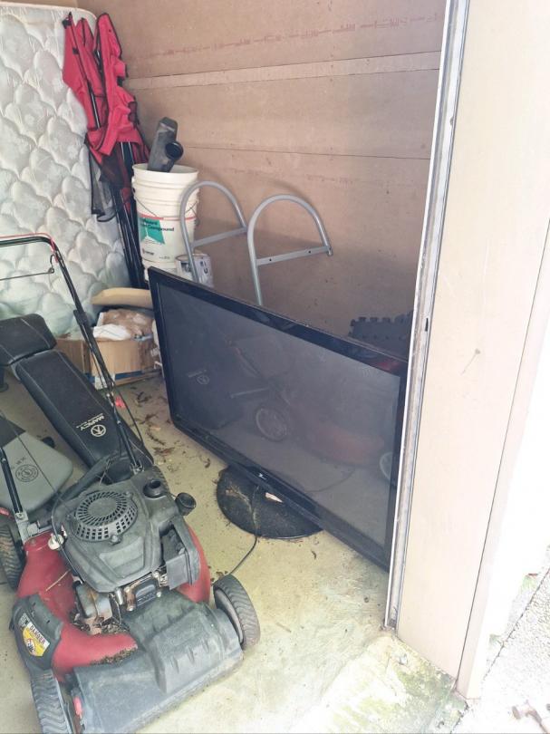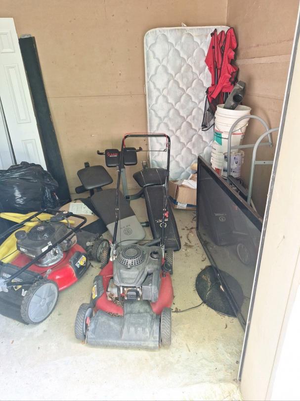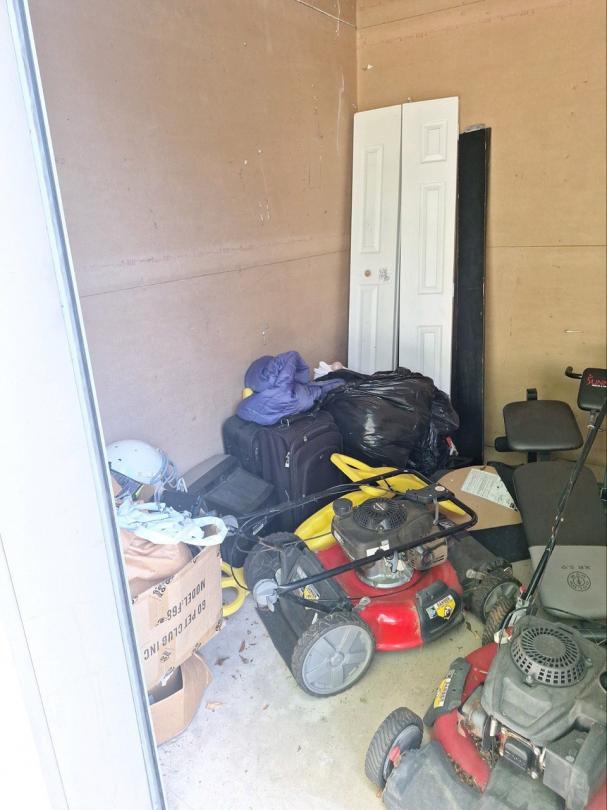 This unit appears to contain…Lawnmowers, gym equipment, tv, mattress, suitcase, sporting goods