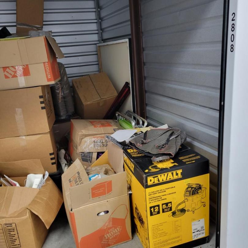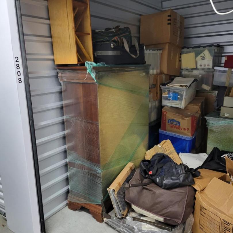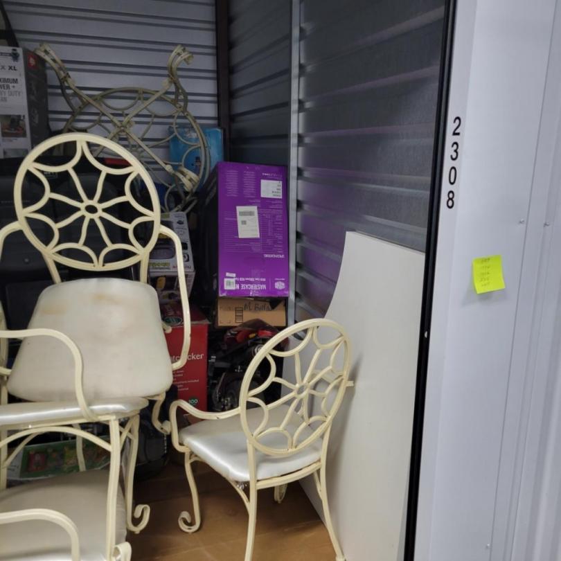 This unit appears to contain…Unit appears to contain dresser, night stand, misc furniture, shop vac, lawn chair, boxes and misc items