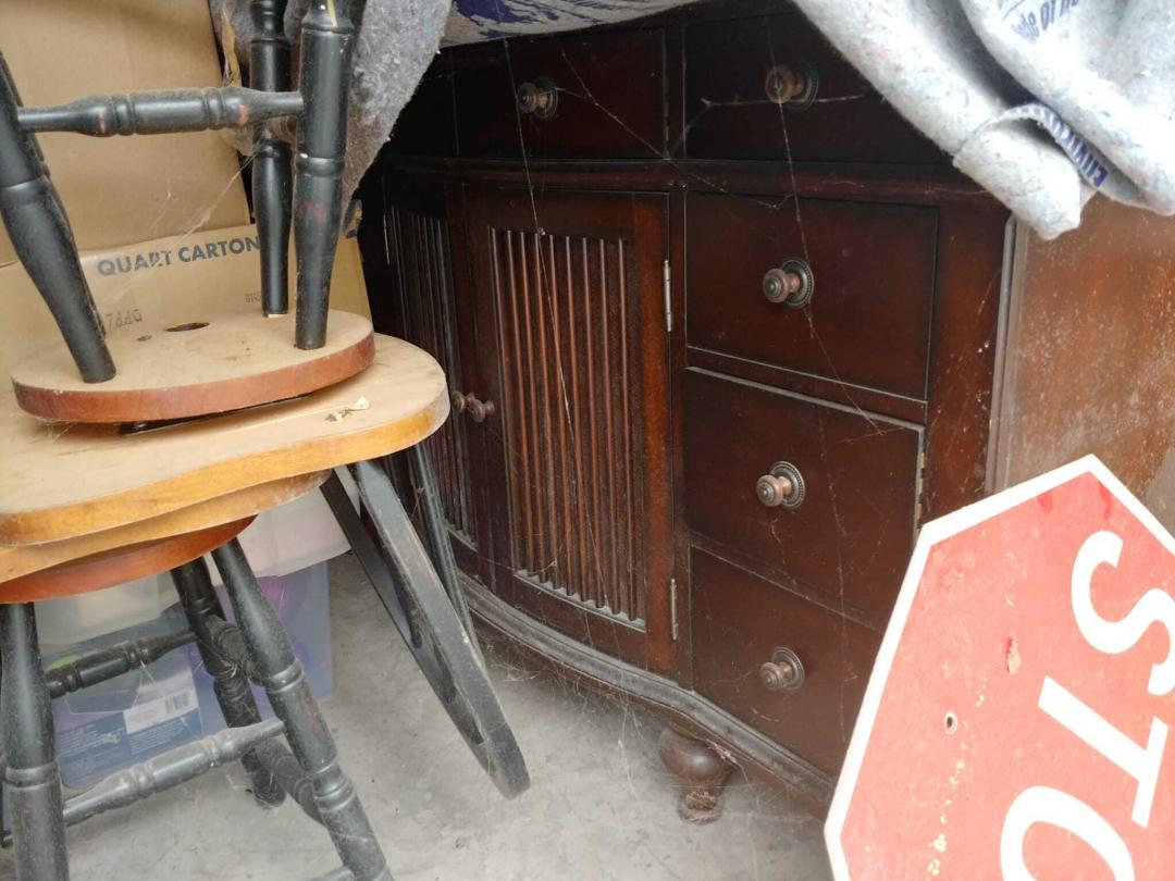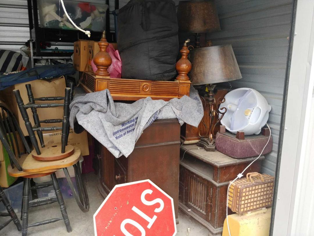 This unit appears to contain…Buffett-Bureau Lamps Table Chairs and stool Stop sign Misc.