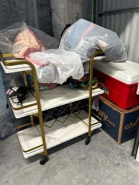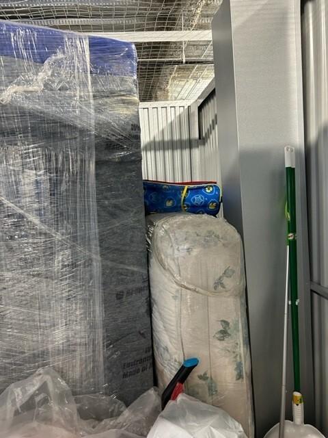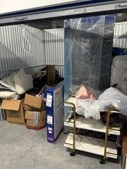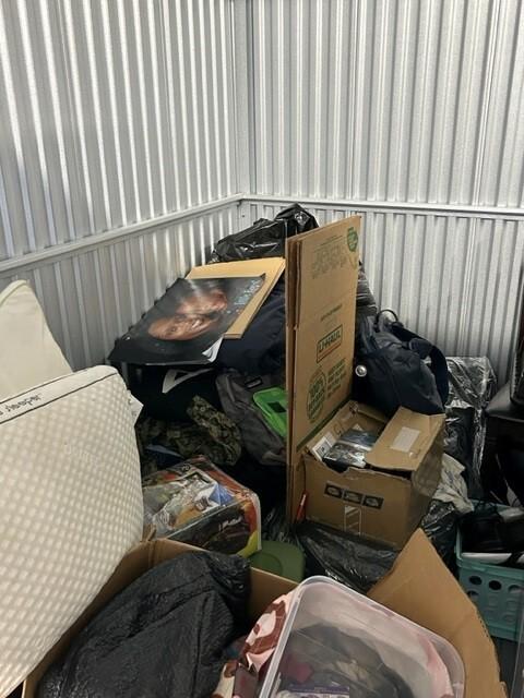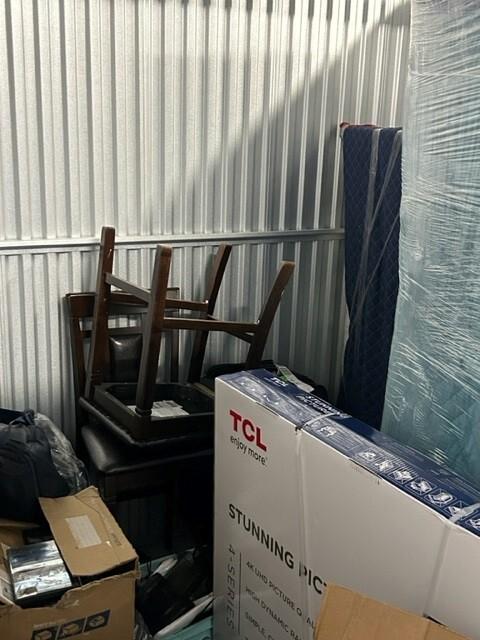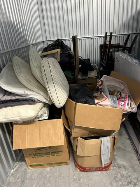 This unit appears to contain…TV, wine cart, cooler, pillows, chairs, boxes, couch, mattress, suitcase