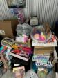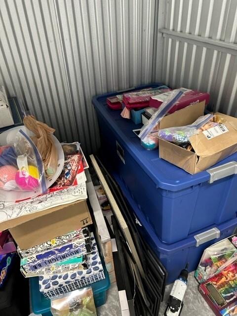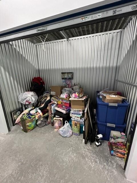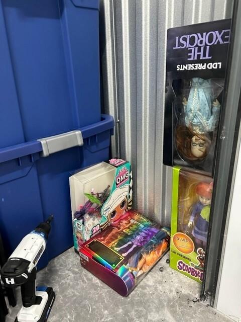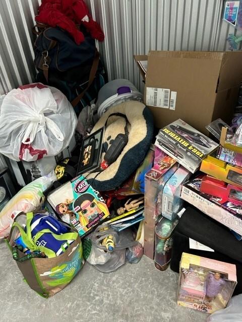 This unit appears to contain…Collectible dolls, dog bed, suit case, toys, bags
