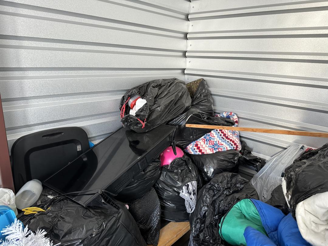 This unit appears to contain…Bags of clothing, childrens toys, flat screen TV, hutch