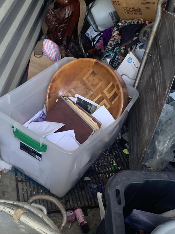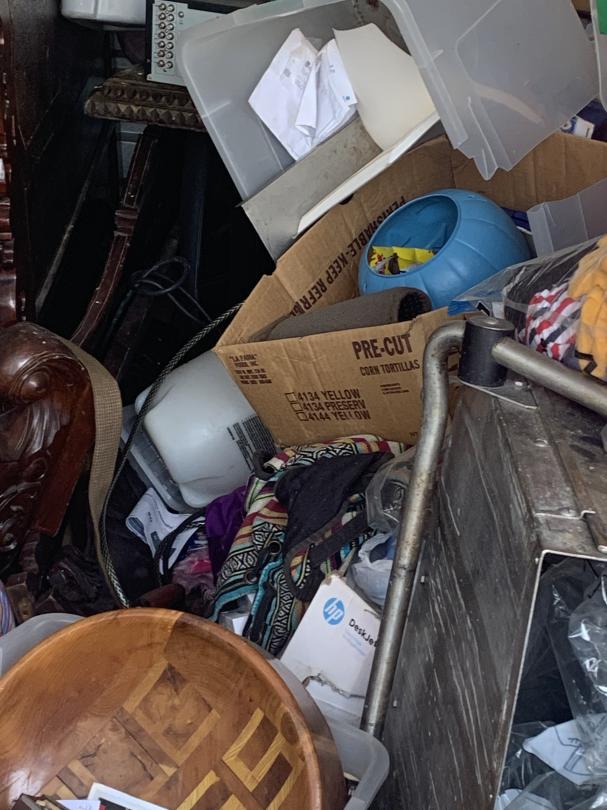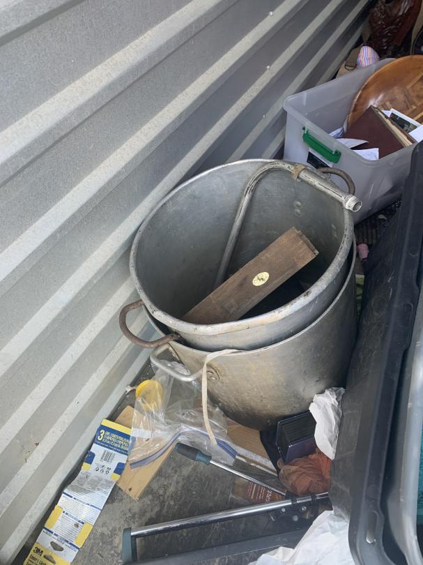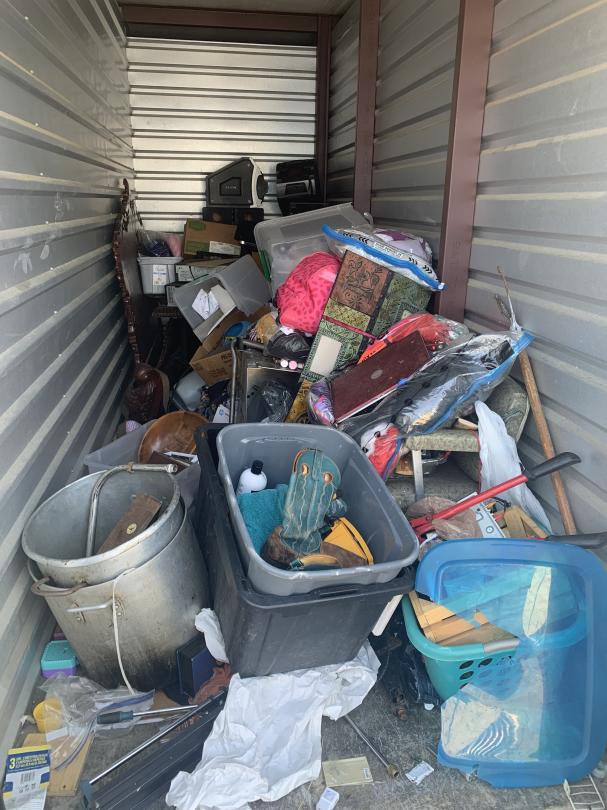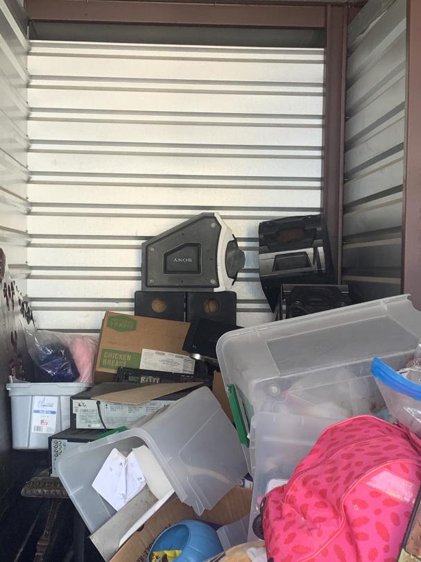 This unit appears to contain…Cowboy boots, Speakers, Jack, Bolt Cutters, Totes, Bags, Clothes, Bed Frame, Electronics, Crawfish pot, Laptop