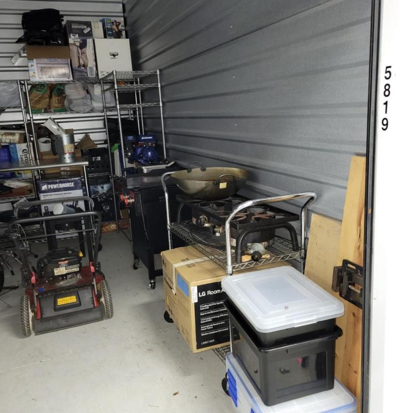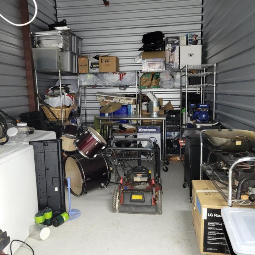 This unit appears to contain…Unit appears to contain washer & dryer, drum set, compressor, outdoor griddle, outdoor gas cook top, metal table, keyboard, fan, metal racks, metal table, leaf blower, 2-chain saws, push lawn mower, various small lawn equipment and misc items.