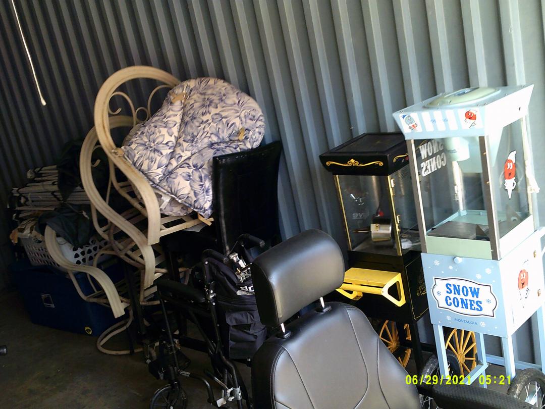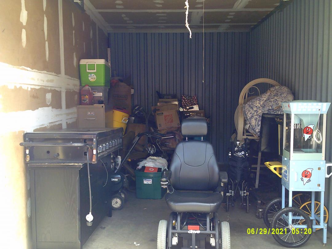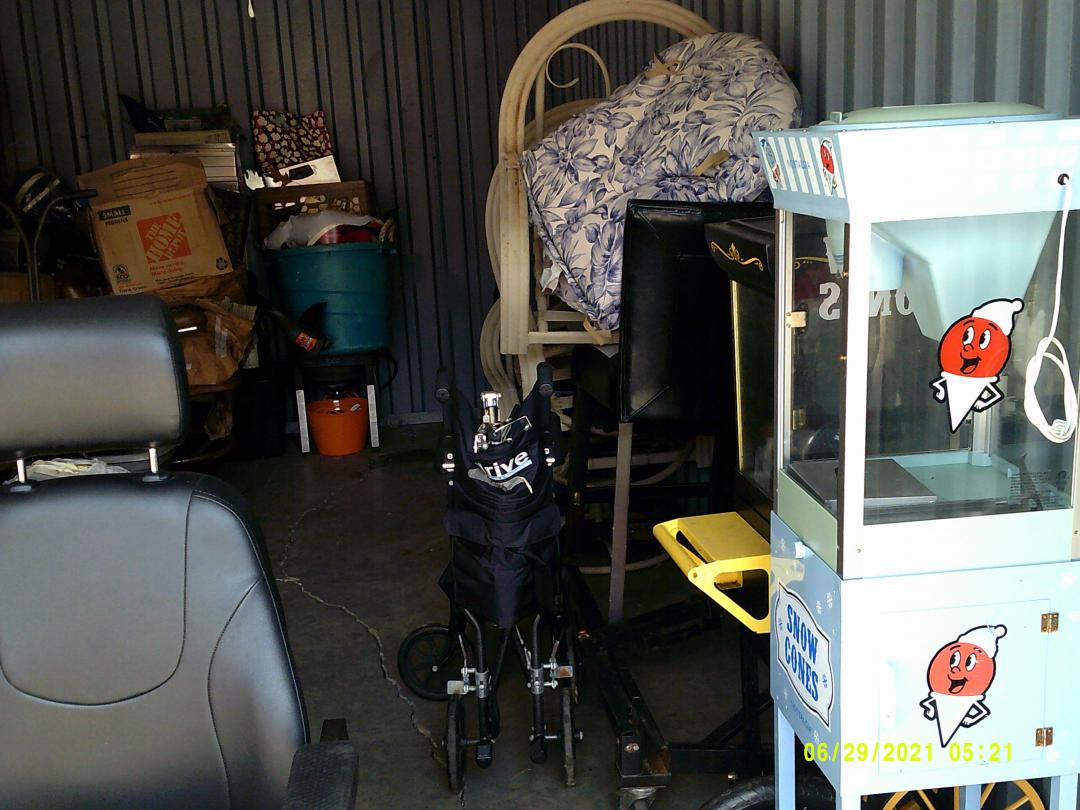 This unit appears to contain…READ ALL AUCTION RULES BEFORE BIDDING!!! Unit appears to contain: Snowcone maker, popcorn maker, grill, dresser, coolers, chairs, boxes, totes, powered wheelchairs, lawnmowers