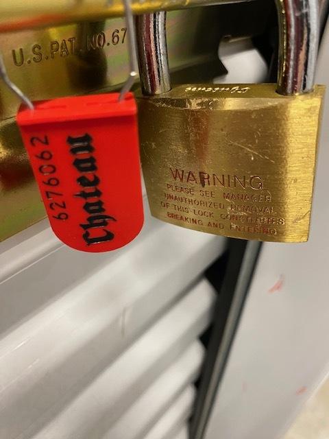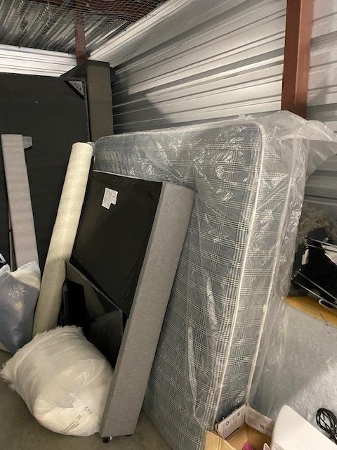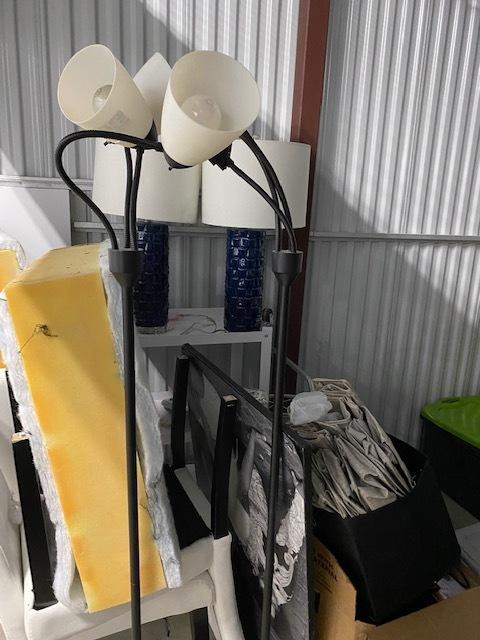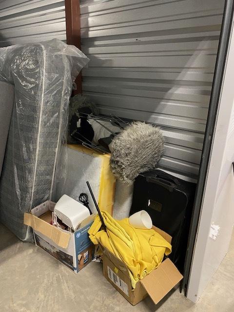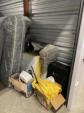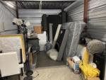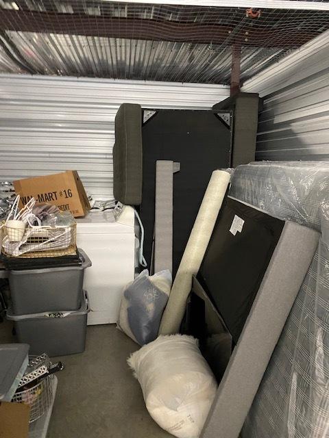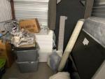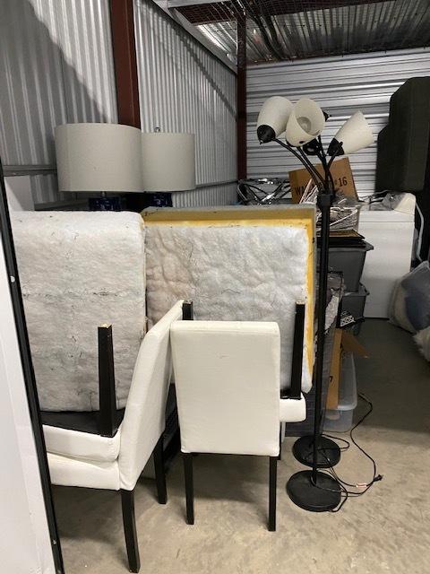 This unit appears to contain…Washer & dryer, 4 white chairs, sofa mattress, plastic totes, boxes, luggage, art work and lamps.