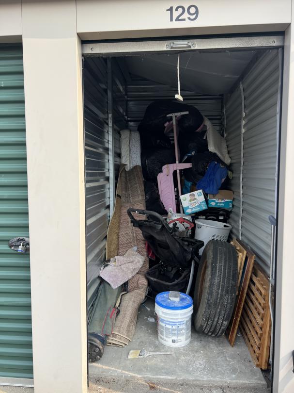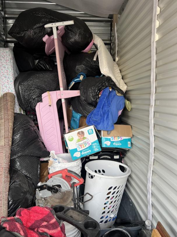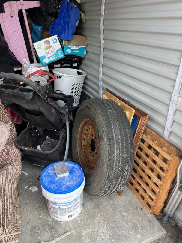 This unit appears to contain…tire, baby items, stroller, kids bed, rug, golf clubs,