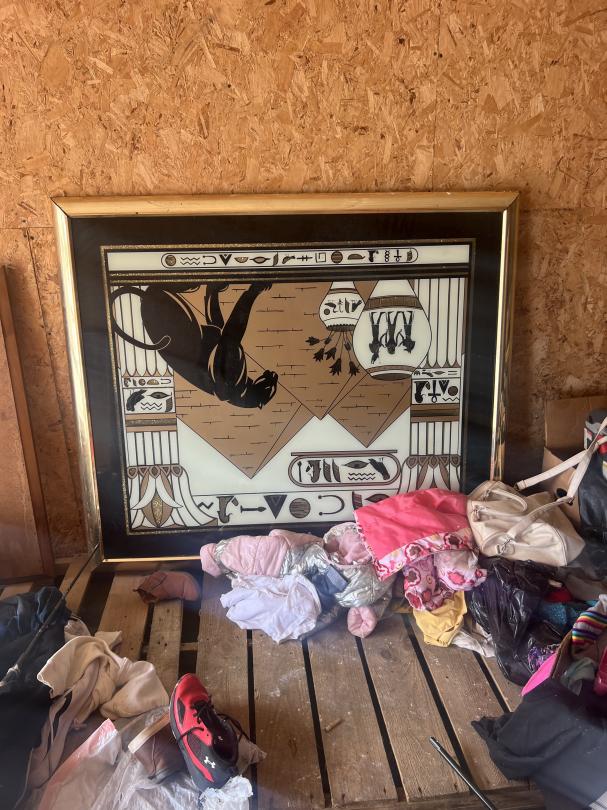 This unit appears to contain…art, full sized fridge, stove, hose, side table, ac window unit, clothes and shoes