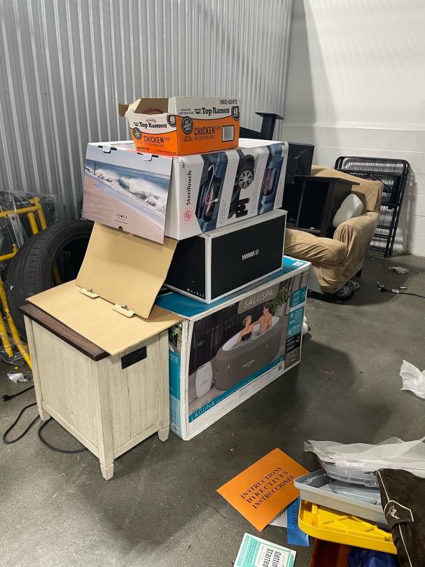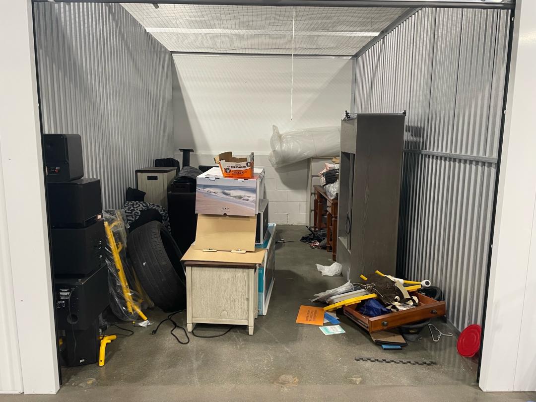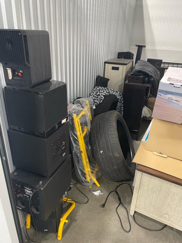 This unit appears to contain…stereo equipment, tires, furniture, tables, chair