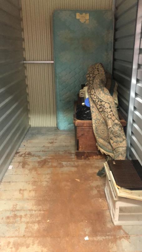 This unit appears to contain…Wooden trunk, area rug, air conditioner, twin mattress, and miscellaneous plastic bag.