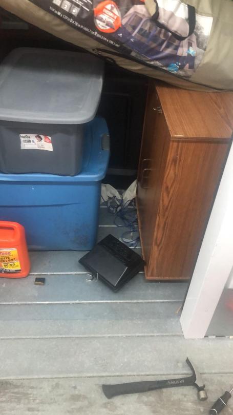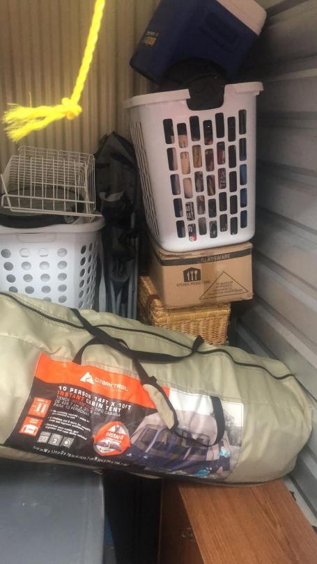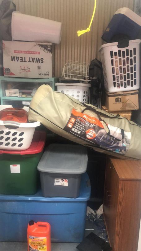 This unit appears to contain…Miscellaneous boxes, laundry baskets, miscellaneous totes, tent and storage.